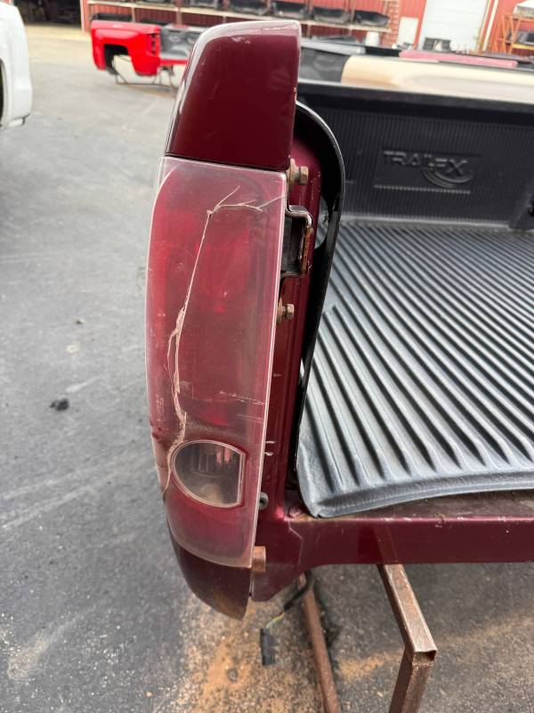 This bed comes with taillights that are faded and cracked. This bed does not include a tailgate. This bed has a plastic bed liner. There are also dings on both top rails.