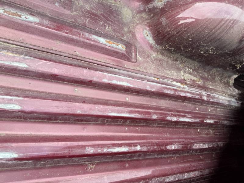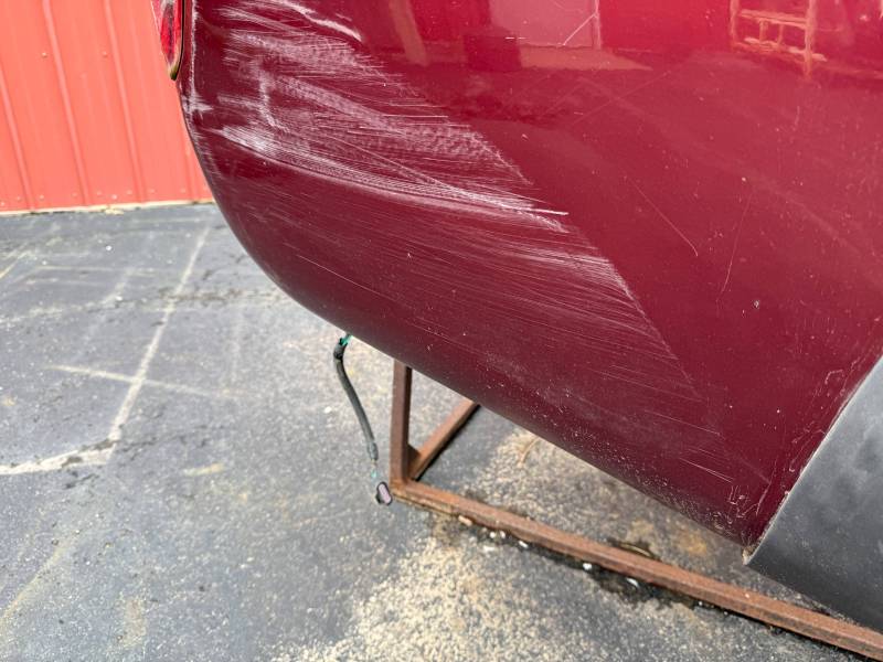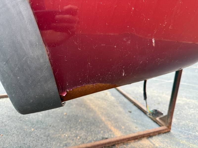 The left/driver's side rear has a quarter-sized dent, and the left side by the top rail has (5) dime-sized dings, and the left rear lower paint is peeling away.