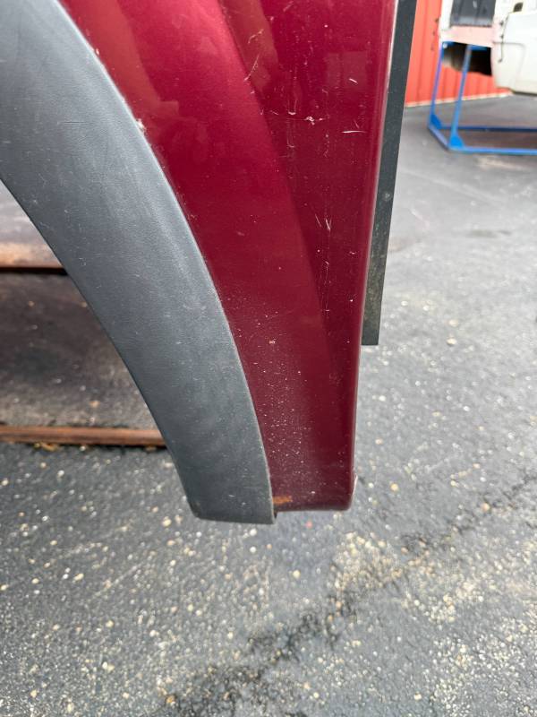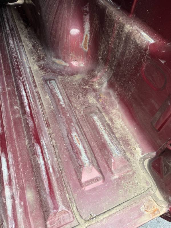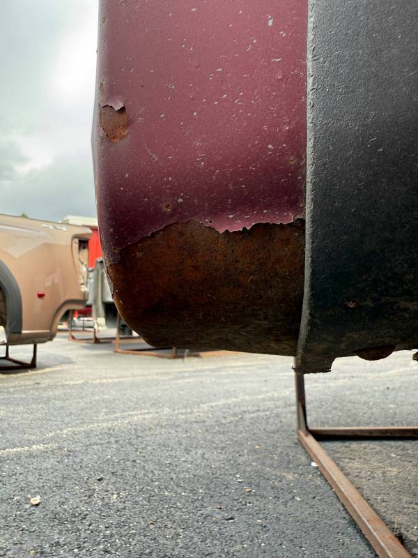 This bed features factory gray textured fender flares, but there is visible rust behind them. Both front lowers have stone chips from going down a gravel road.