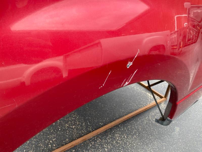 The left/driver's side has a scratch on the wheel arch and a dime-sized dent.