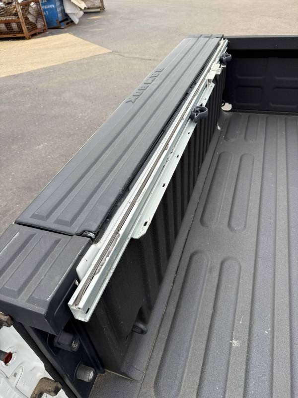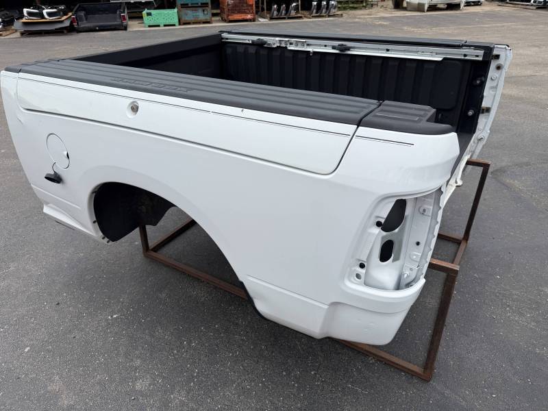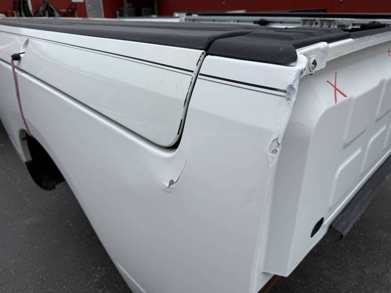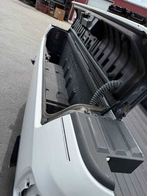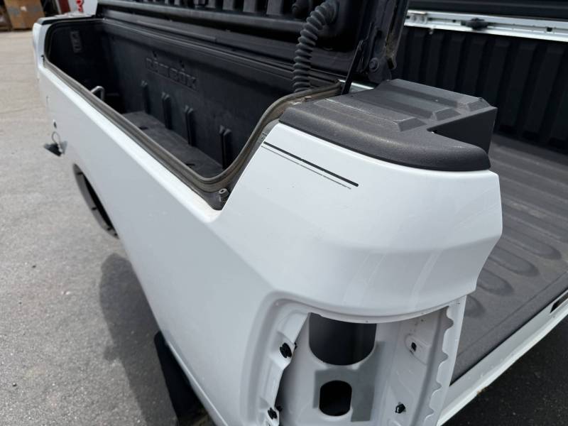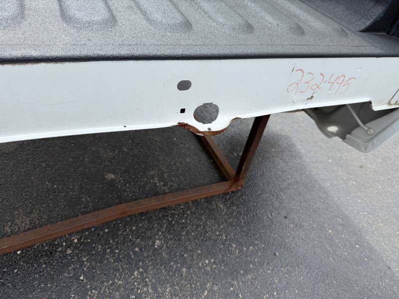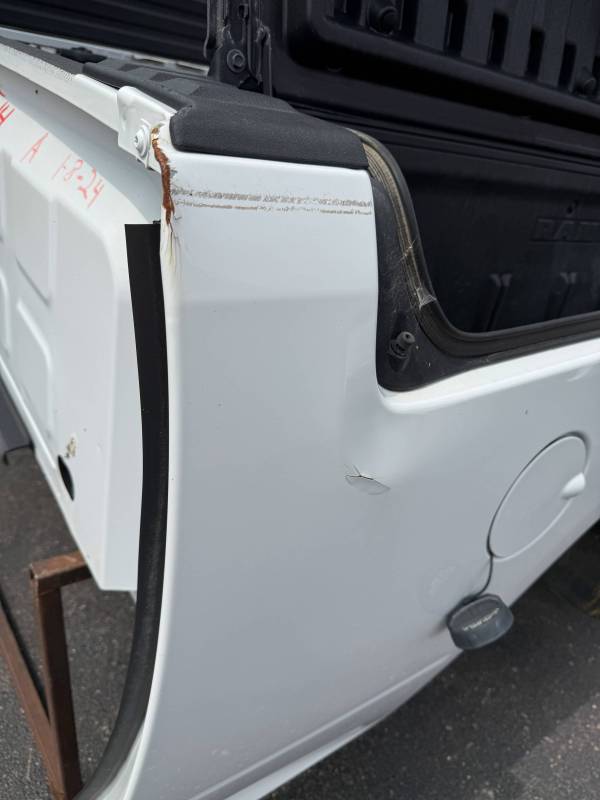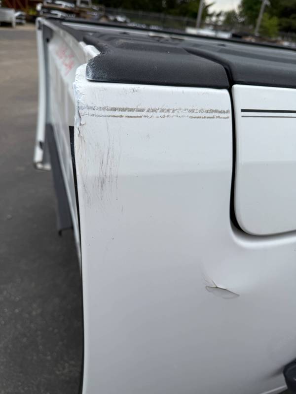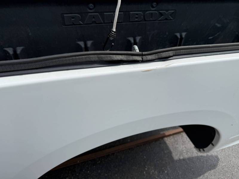 This bed comes without taillights and without a tailgate. This bed has a spray-in bed liner. Both front edges are rubbed from transport, and the left and right front lower of the rambox has a golfball-sized dent.