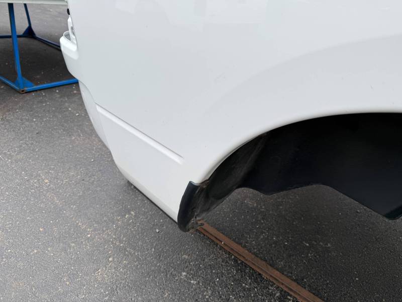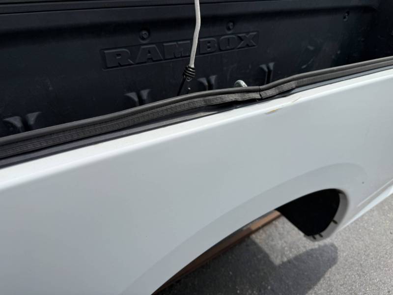 The right/passenger side has a crack in the paint by the rambox latch. The back bottom edge of the floor has a minor bend, and the right side rambox lock is missing, and the latch is broken