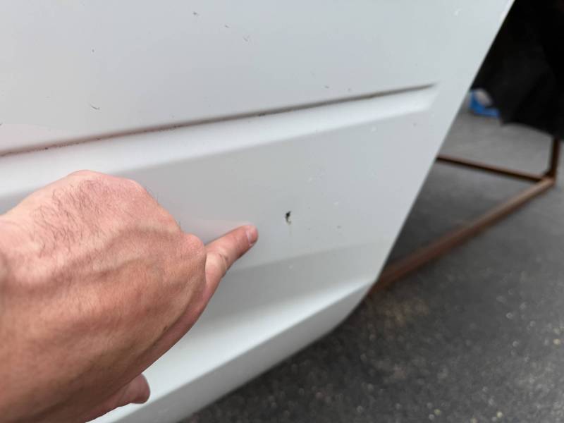 The left/driver's side front lower has a quarter-sized dent, and the left rear lower has a golfball-sized dent.