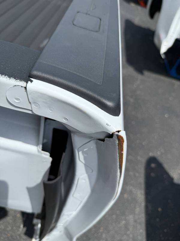 The left/driver's side front edge has a quarter-sized ding, and the left rear side by the top rail has a minor dent. The left side by the top rail has (3) quarter-sized dents.