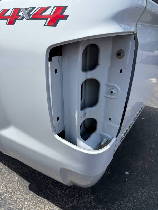 This bed comes without taillights, but it does come with a tailgate. The tailgate has some small dents by the top edge, but it is still very usable. The tailgate has a camera hole in the handle, but it is missing the camera. There are (2) 1" holes drilled in the rear of the floor.