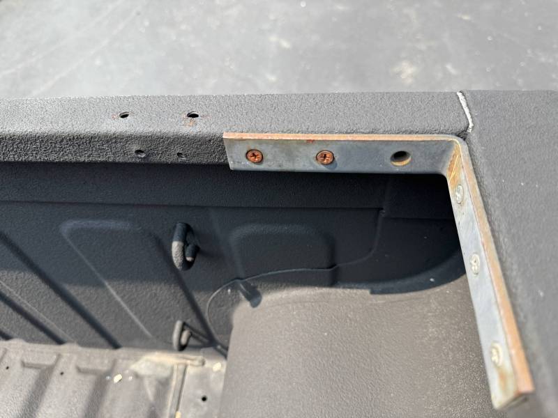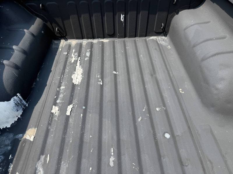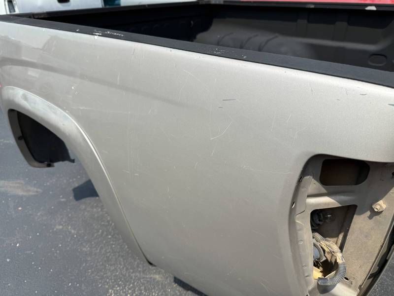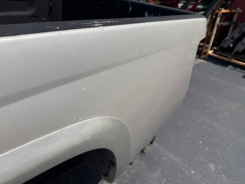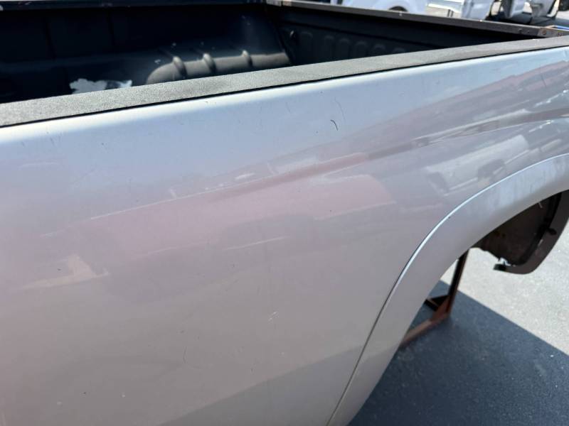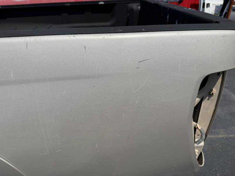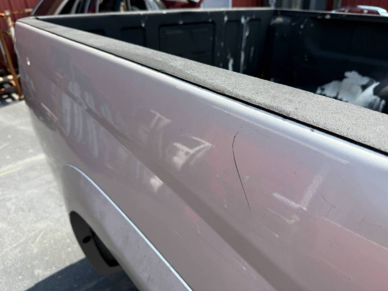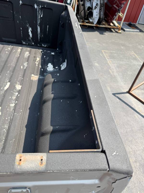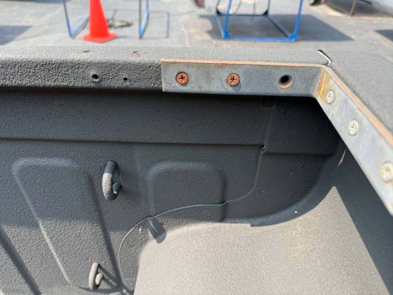 This bed does not include taillights, but it does come with a tailgate. The tailgate has (3) dime-sized dings on the top edge and a minor ding on the left rear. This bed has a sprayed-in bed liner that goes over the top rails. There is paint spilled on the floor and (5) 1/8" holes drilled on the inner bed rails. There are also (2) 4" L brackets mounted to the inner front header panel.