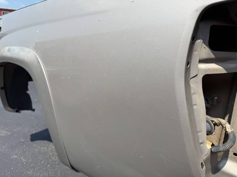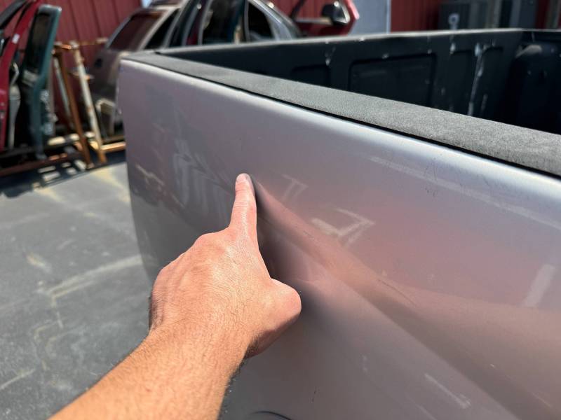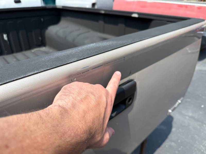 Both sides have factory-painted fender flares, and both front lowers have some stone chips from going down a gravel road. There are also scratches on both sides. Both rear bed sides and the tailgate are rubbed from a truck cap, and both sides by the top rail have (4) dime-sized dings.