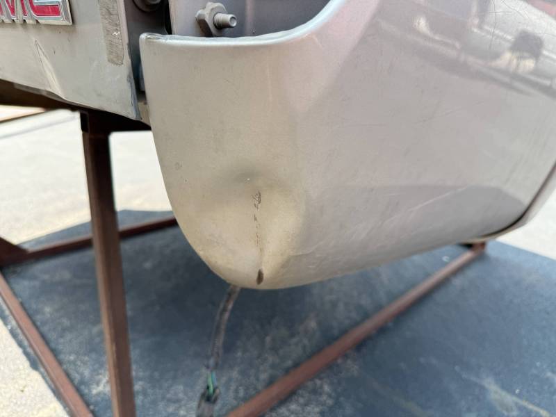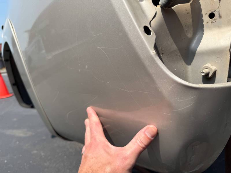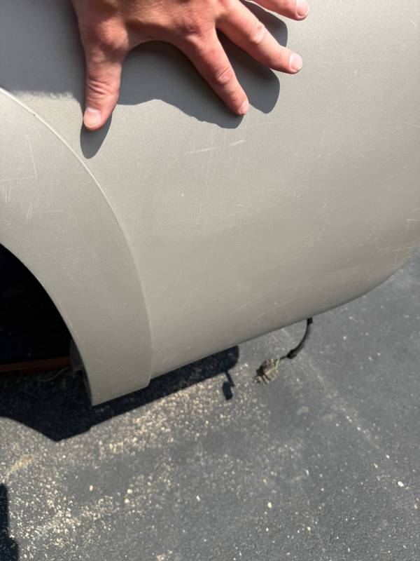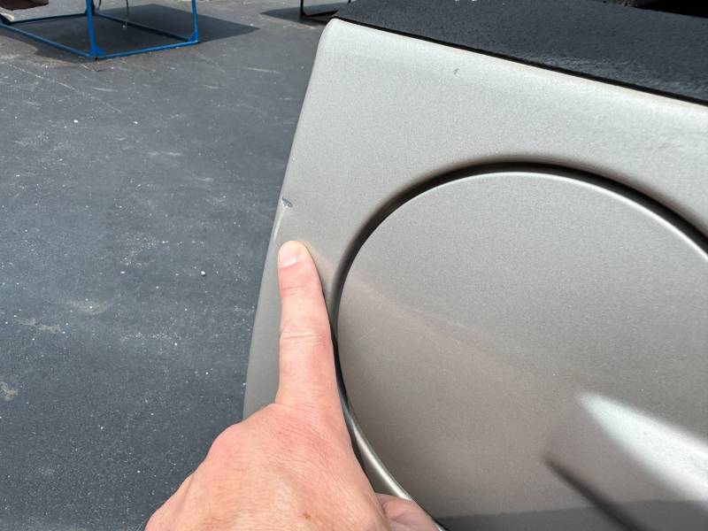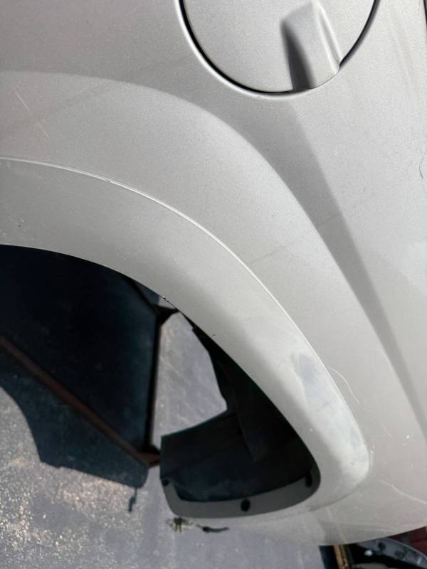 The left/driver's front edge has a dime-sized ding, and the left rear lower has a faint 4" crease and a golfball-sized dent. The left rear lower under the taillight area has a quarter-sized dent and the wheel arch has a flat dent that is hard to see.