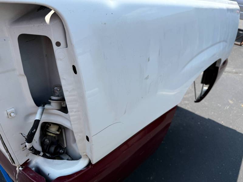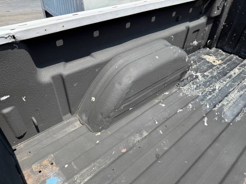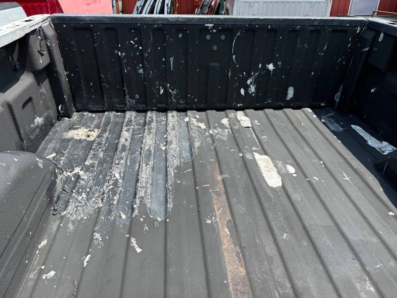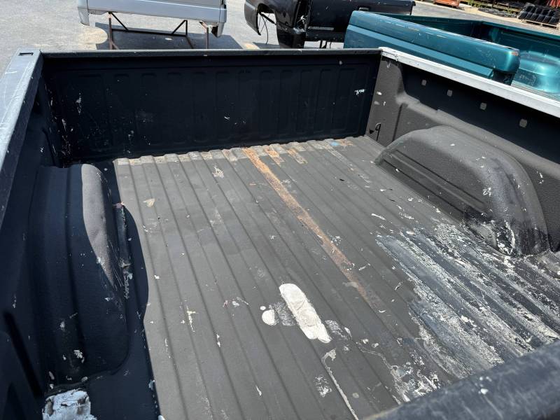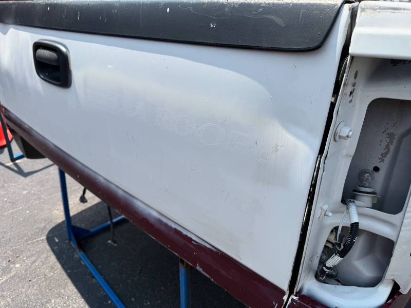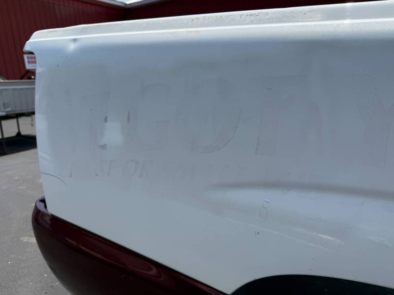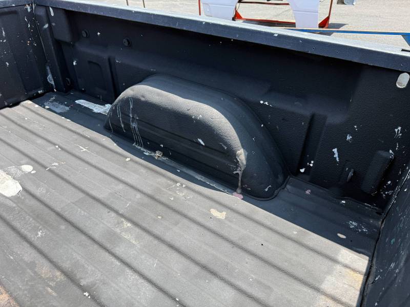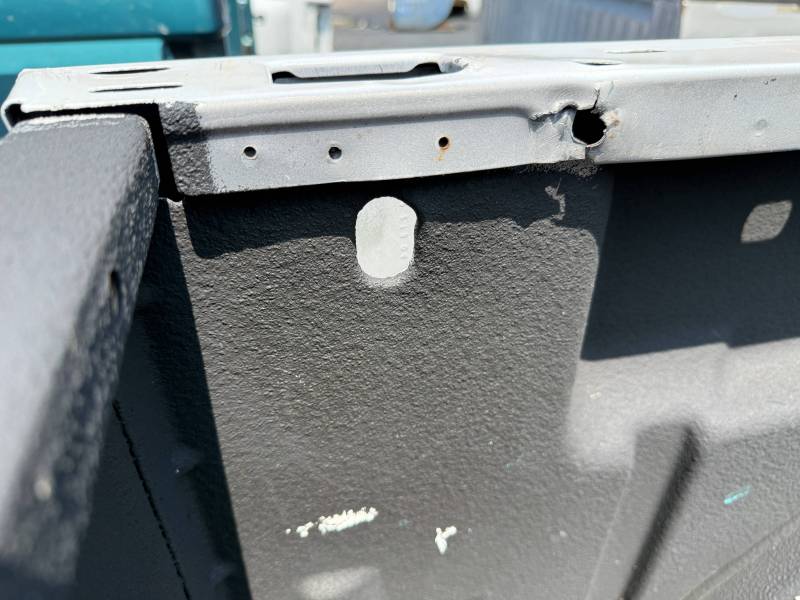 This bed does not come with taillights, but it does come with a tailgate-the tailgate has a softball-sized dent on the left-hand side and a golfball-sized dent down on the right-hand side. The inside of the bed has a sprayed-in bed liner and paint spilled on the floor. The right front and rear of the floor have (2) holes drilled in the floor from a ladder rack and the right front of the header panel has (2) holes drilled in it from a ladder rack. The right inner bed rail has (6) 1/8" holes drilled in it, and the rear inner stake pocket hole has (2) larger holes in it.