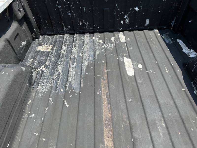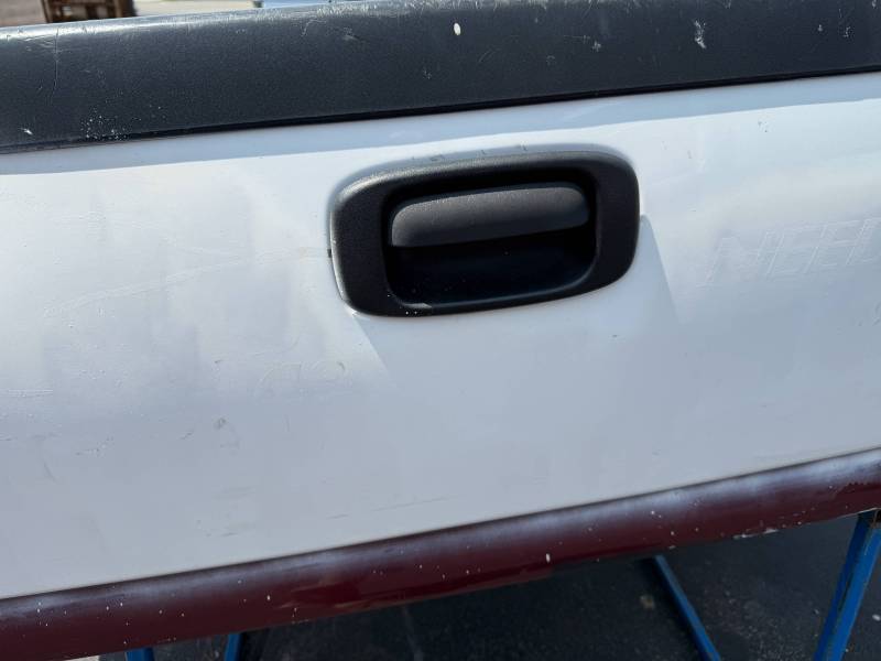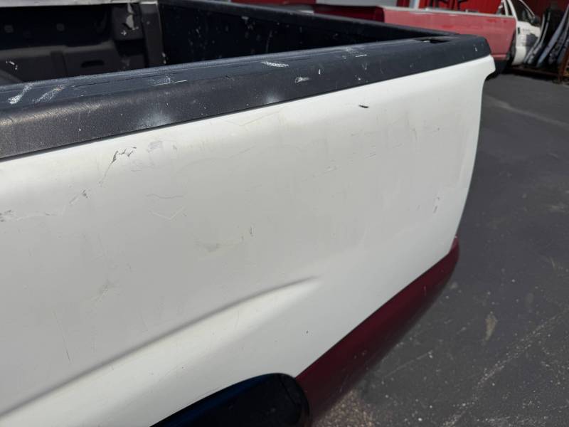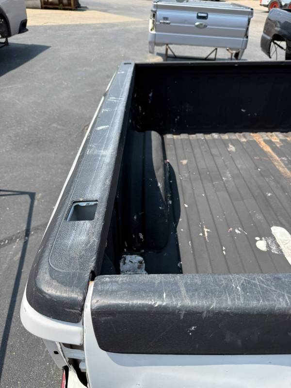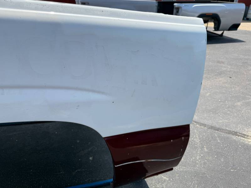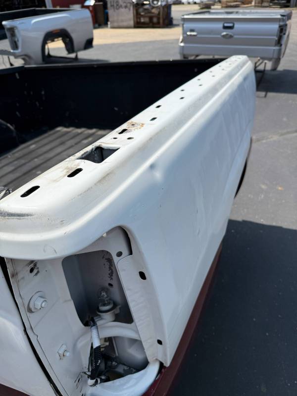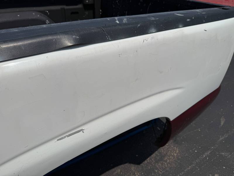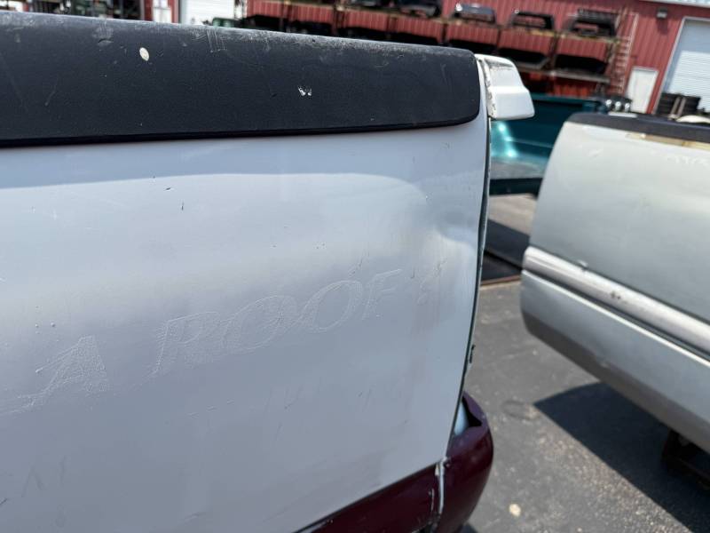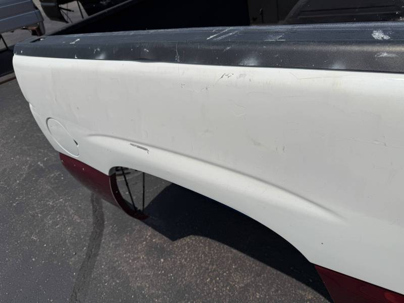 This bed does not come with taillights, but it does come with a tailgate-the tailgate has a softball-sized dent on the left-hand side and a golfball-sized dent down on the right-hand side. The inside of the bed has a sprayed-in bed liner and paint spilled on the floor. The right front and rear of the floor have (2) holes drilled in the floor from a ladder rack and the right front of the header panel has (2) holes drilled in it from a ladder rack. The right inner bed rail has (6) 1/8" holes drilled in it, and the rear inner stake pocket hole has (2) larger holes in it.