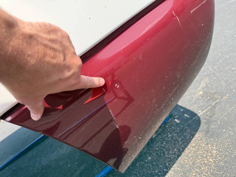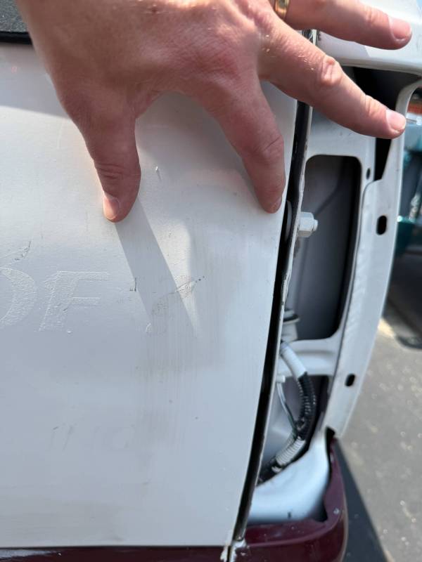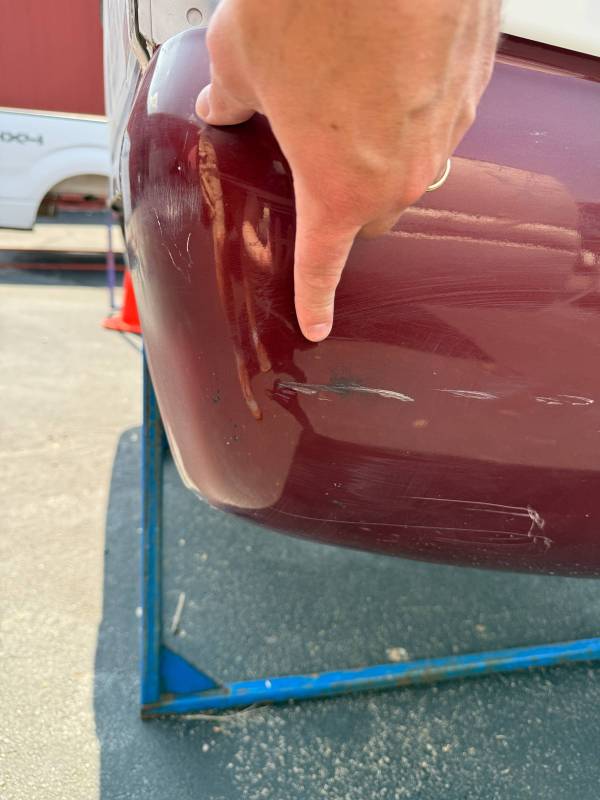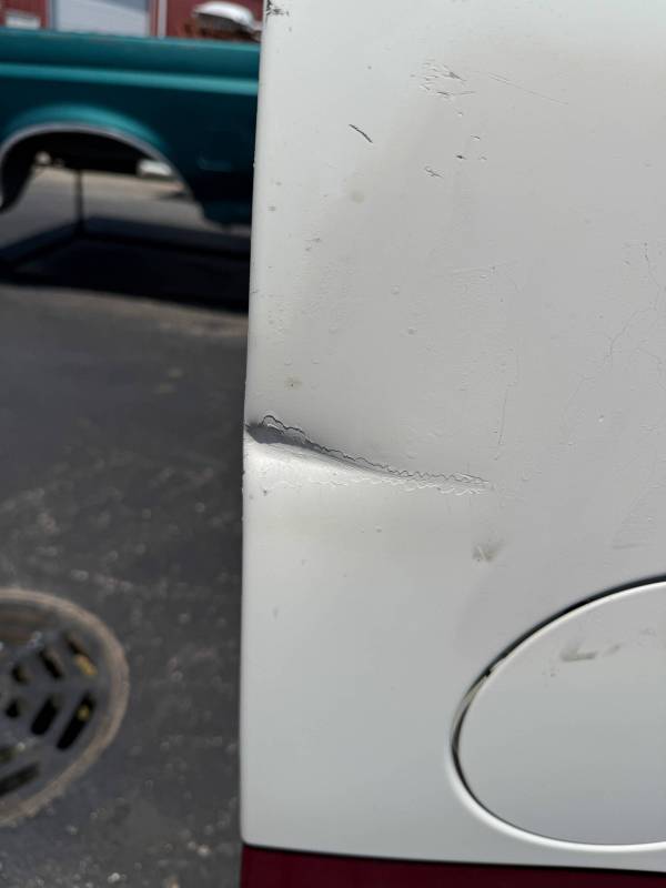 The left/driver's side front edge has a 3" crease and dent. The left wheel arch has an outty dent and the left front lower has a dime-sized ding.