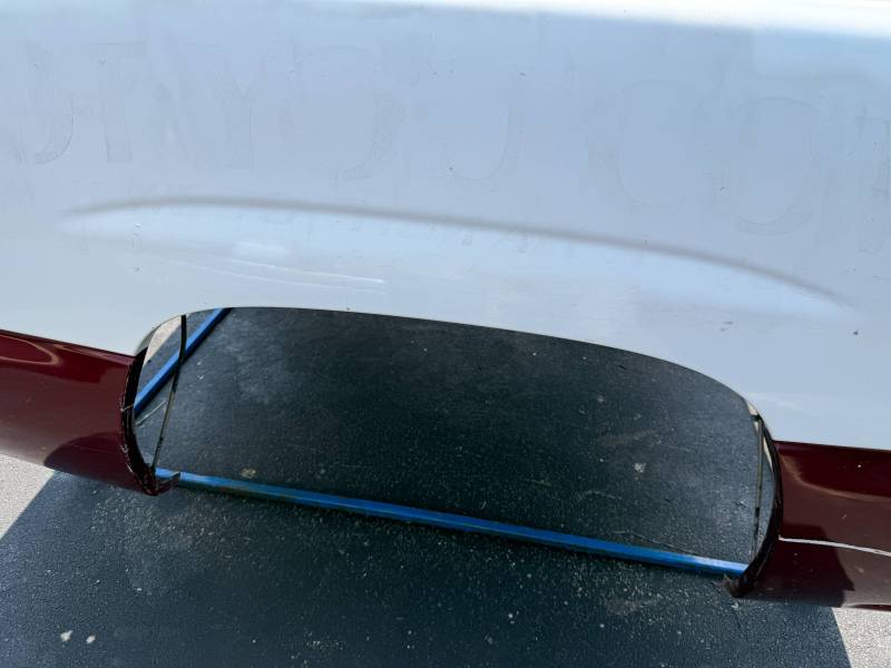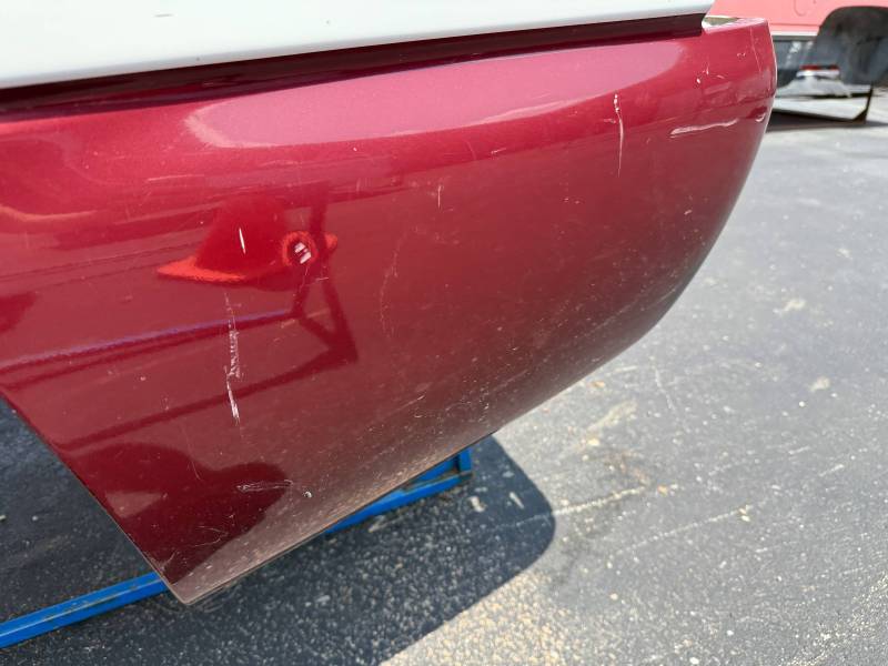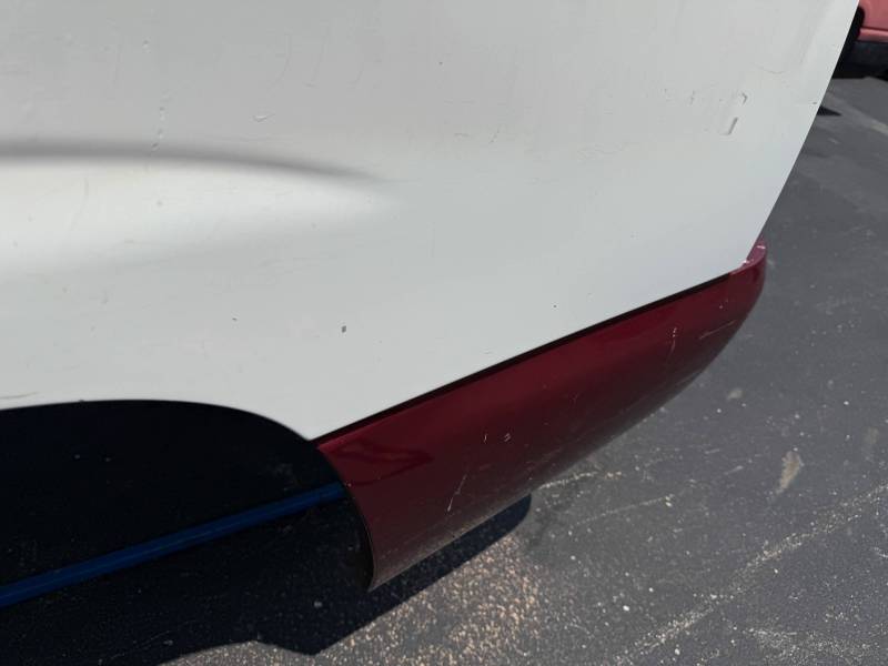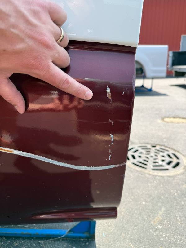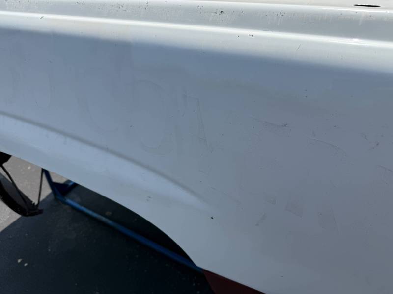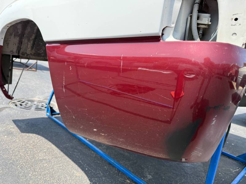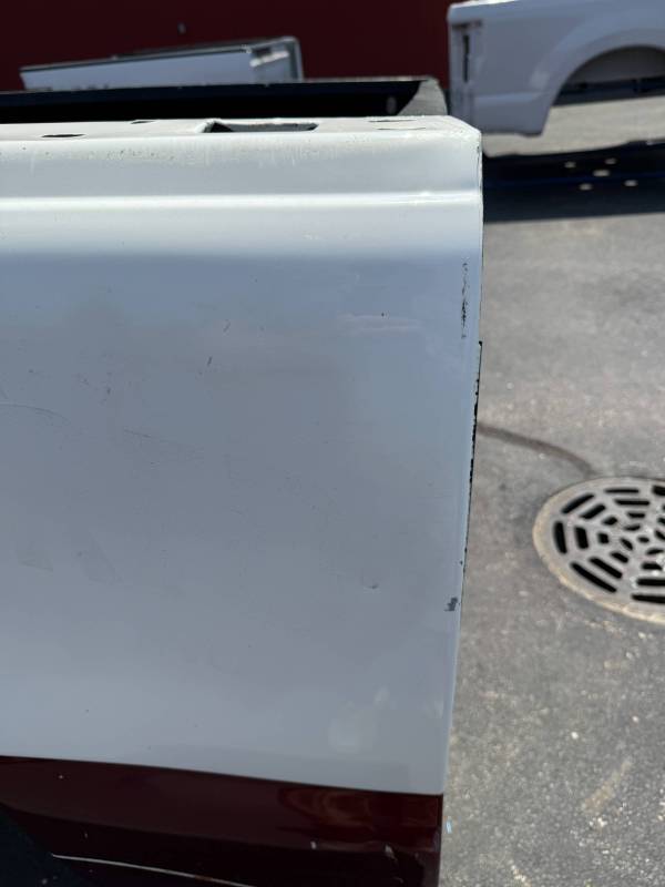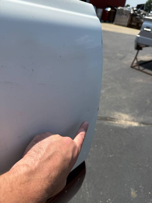 The right/passenger side is missing the top plastic bed rail, and the paint is rough and has been spray painted and the right rear has a quarter-sized ding by the top rail. The right rear lower has a quarter sized dent and the right front lower has a quarter-sized dent. The right front also has a quarter-sized dent.