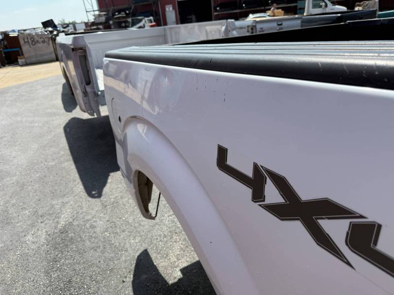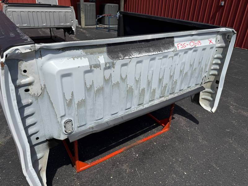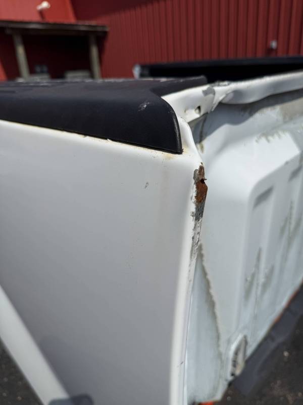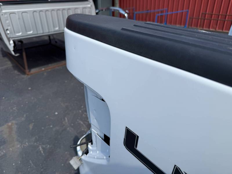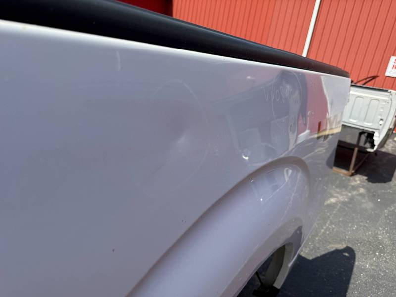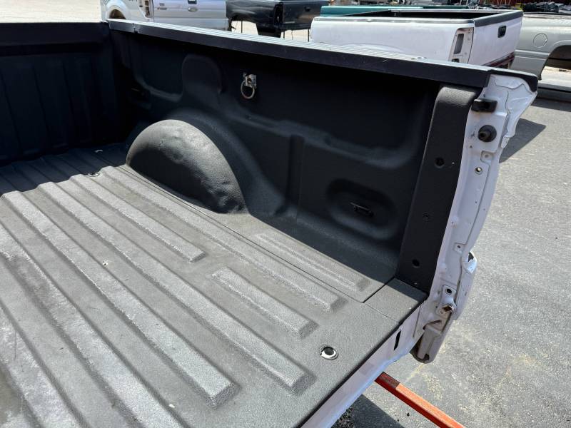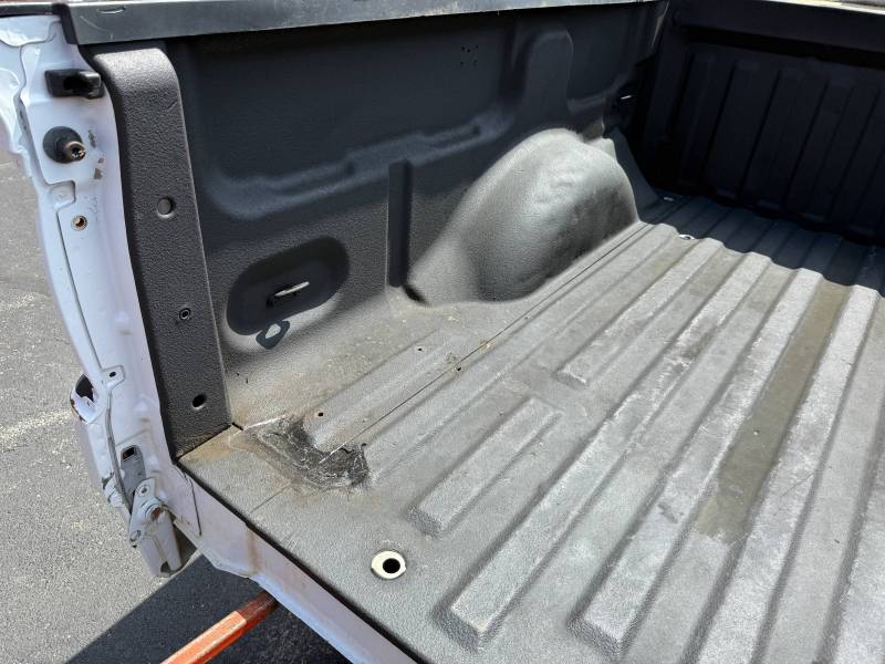 This bed does not have taillights or a tailgate. This bed has a sprayed-in bed liner. The right side inner bedside has a tie-down hook. The left inner bedside has (5) holes from a tie-down hook and (1) hole on the wheel tub, and there are (4) holes drilled on the left rear of the floor. The left rear of the floor was cracked and has been welded for repair.