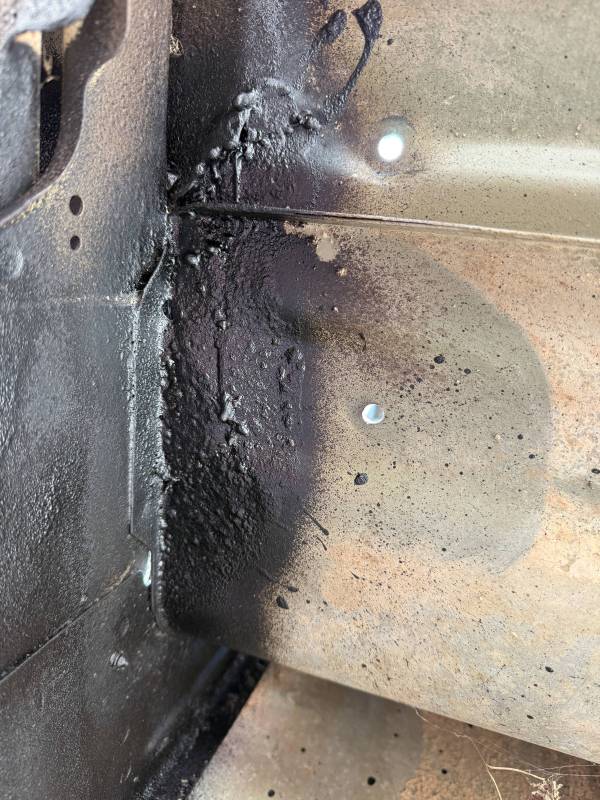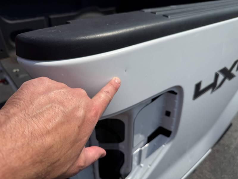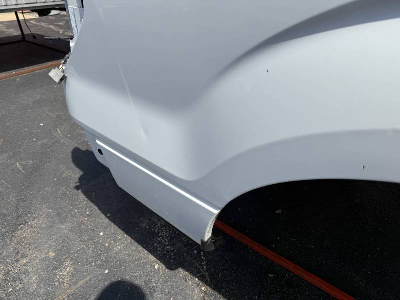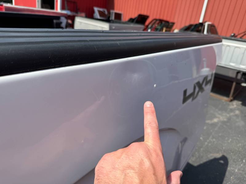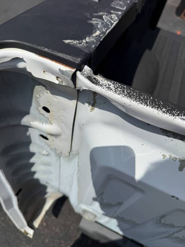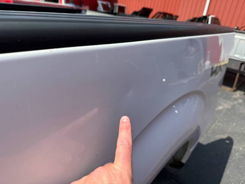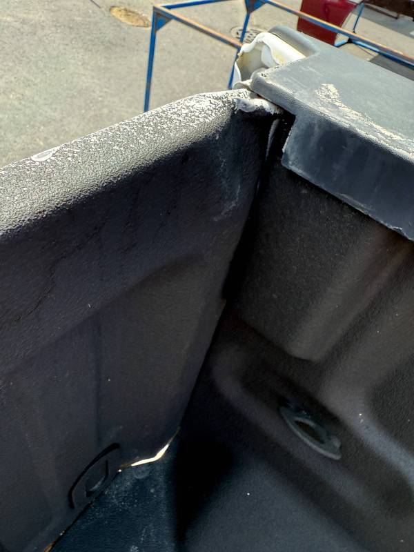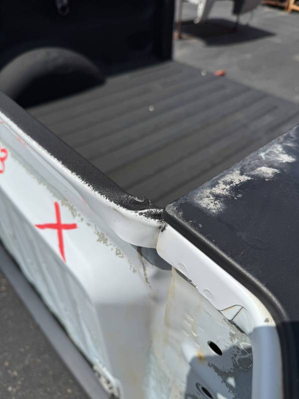 This bed does not have taillights or a tailgate. This bed has a sprayed-in bed liner. The right side inner bedside has a tie-down hook. The left inner bedside has (5) holes from a tie-down hook and (1) hole on the wheel tub, and there are (4) holes drilled on the left rear of the floor. The left rear of the floor was cracked and has been welded for repair.
