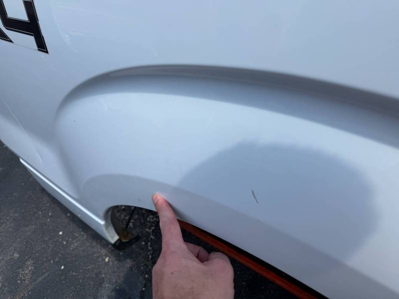The left/driver's side has (10) quarter-sized dents, and the left wheel arch has a dime-sized ding.