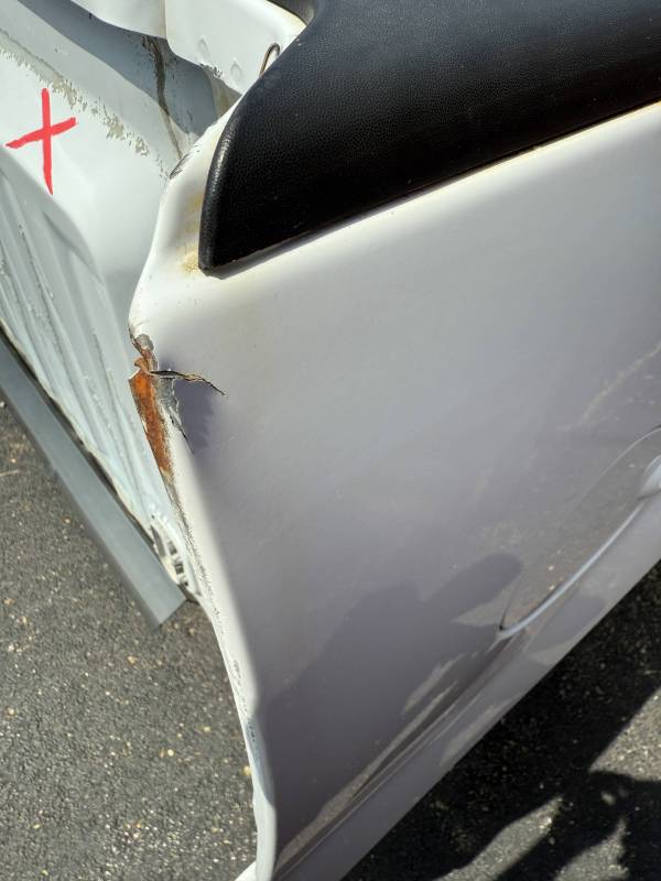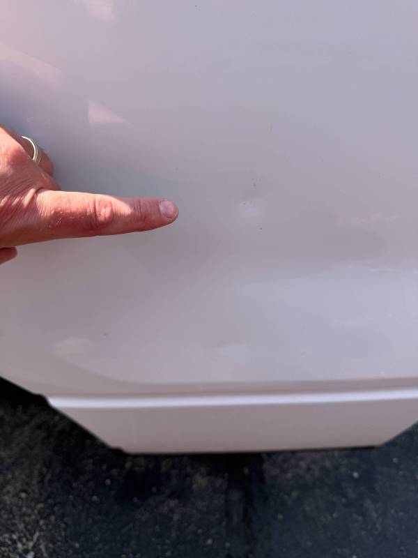 The right/passenger side has (3) dime-sized dings by the top rails, and the right rear has a quarter-sized dent.