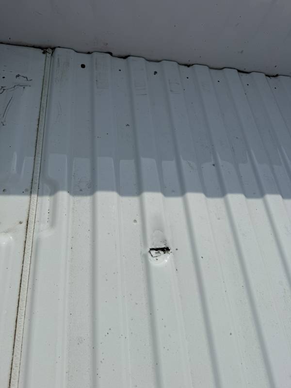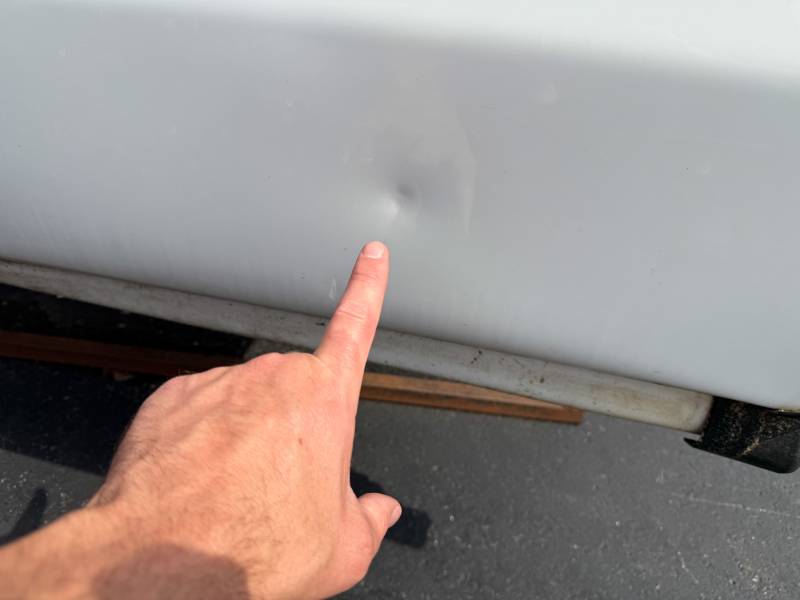 The right/passenger's side front has a golf ball-sized dent, and the right front lower has a quarter-sized dent, and the lower front edge was slightly buckled. The right wheel arch has (2) quarter-sized dents, and the right side above the wheel arch has a quarter-sized dent. The right upper wheel arch is bent in and out.