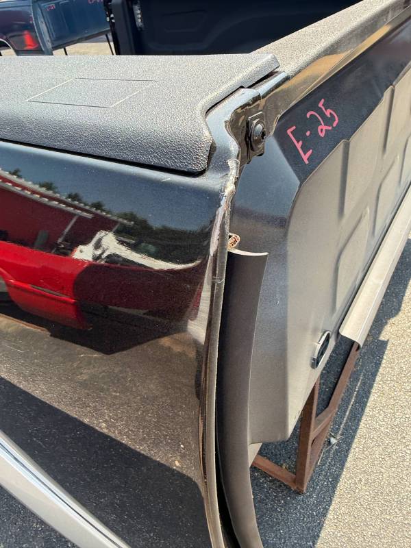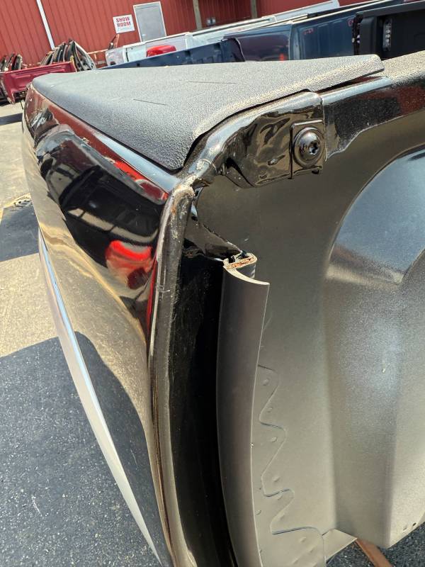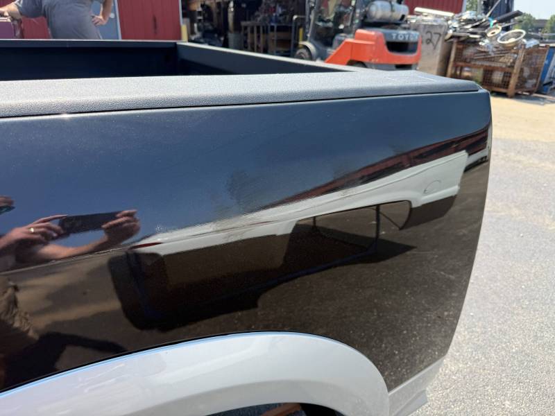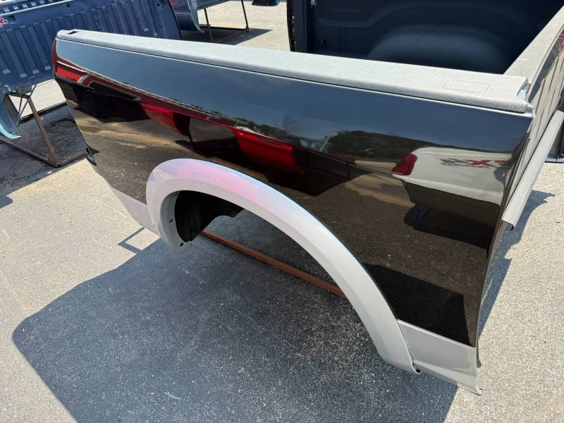 This bed does not have taillights or a tailgate. This bed has silver factory-painted fender flares and a sprayed-in bed liner.