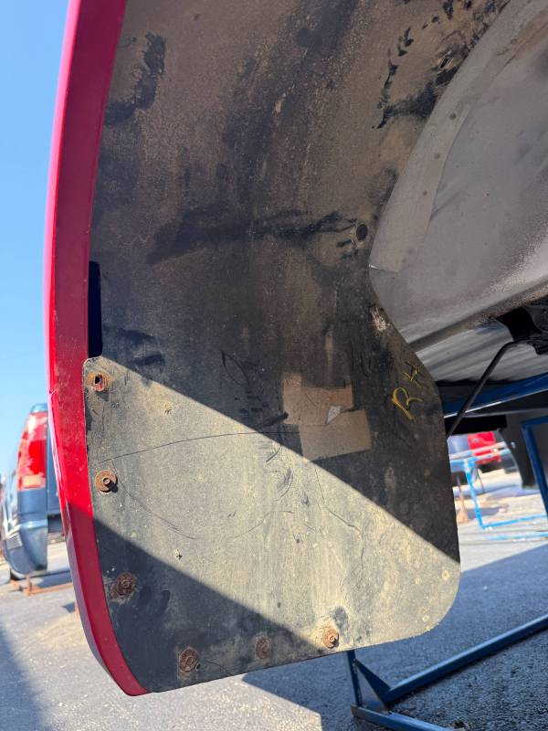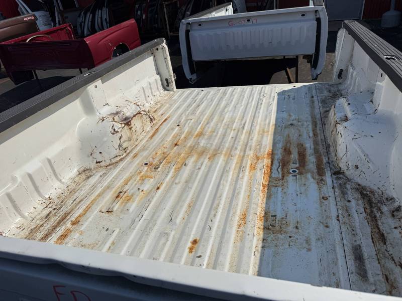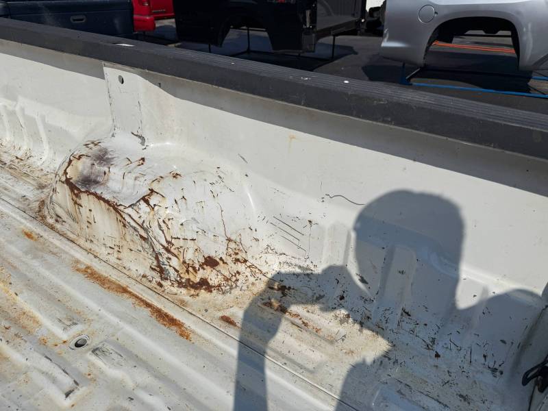 This bed comes without taillights and without a tailgate. The floor is wavy on the inside of the bed and the floor shows signs of usage. This bed is white with red fenders. Both the dually fenders have some waves in them.