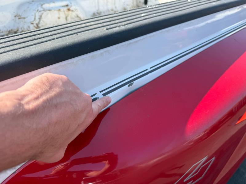 The right/passenger side has a quarter-sized dent by the top rail and a quarter-sized dent where the dually fender meets the bedside.