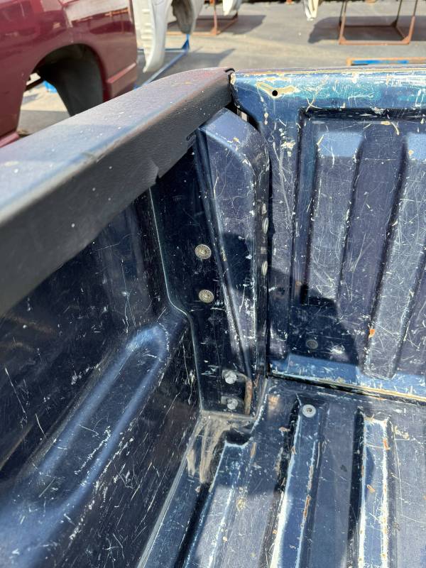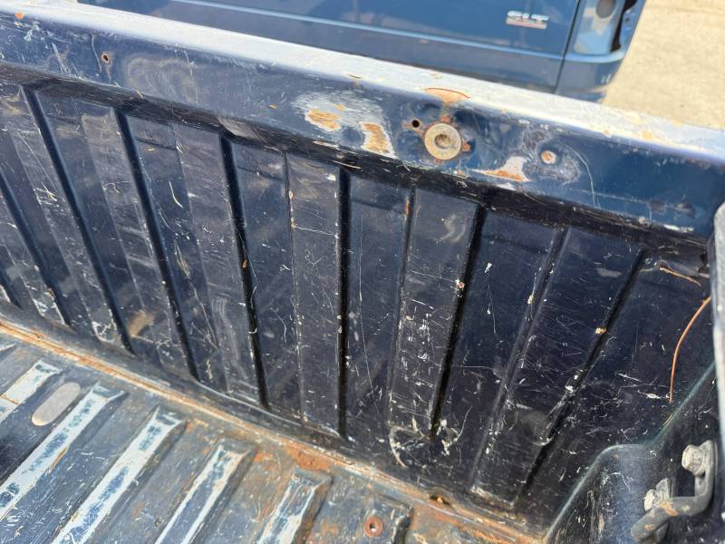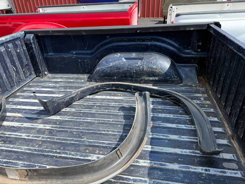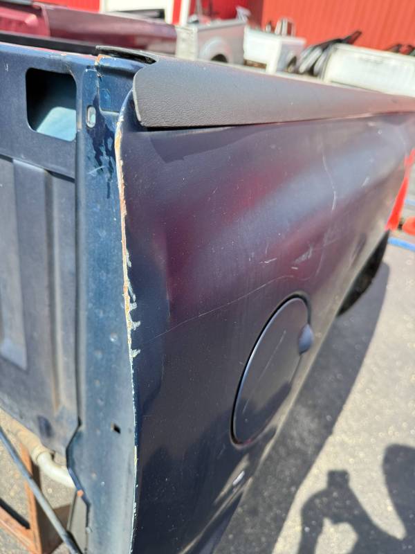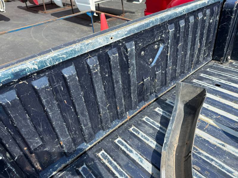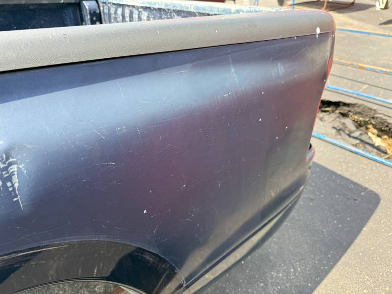 This bed comes without taillights, but it does have a tailgate-the tailgate has (2) dime-sized dings on the top edge and white paint on the outside. There are (2) holes drilled in the floor from a ladder rack. There are also (9) holes drilled in the front header panel from a ladder rack. There are dings on the header panel and (4) holes drilled on the right inner bed lip. The paint is faded. This bed has black plastic bed rail caps.