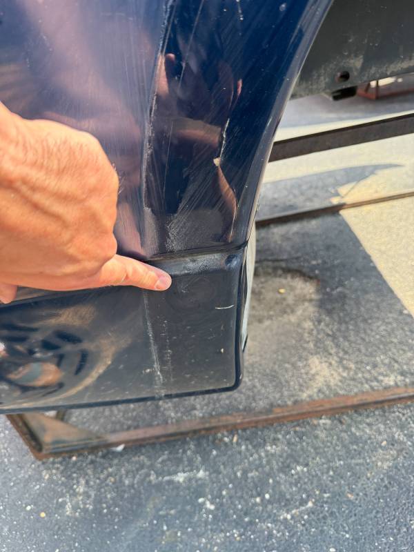 The right/passenger side has (3) dime-sized dings, and the right wheel arch has a quarter-sized dent, along with a dime-sized dent and (2) outty dents. The right front edge has been rubbed and damaged during transport.