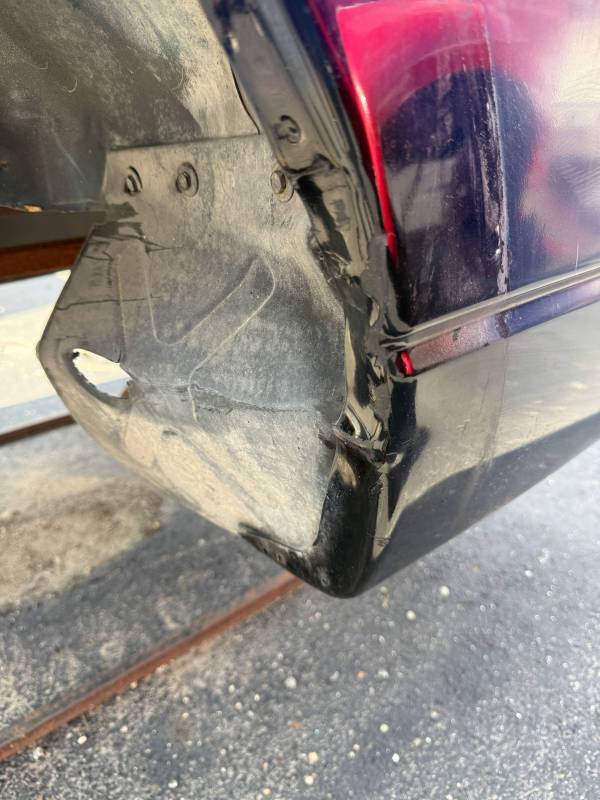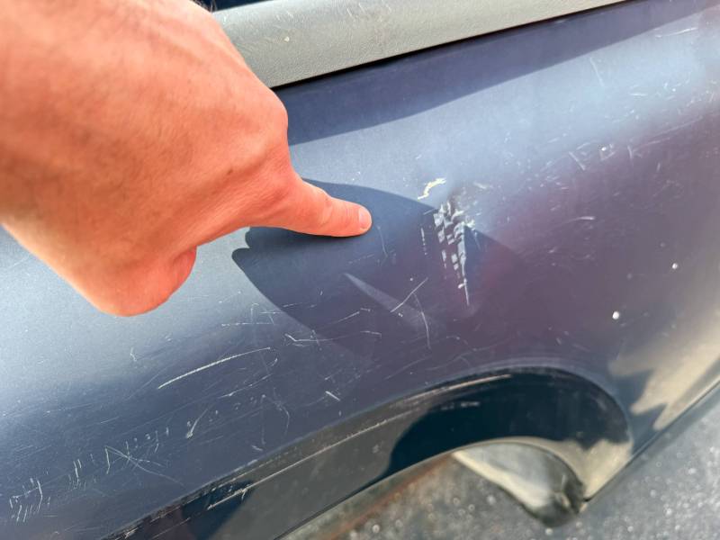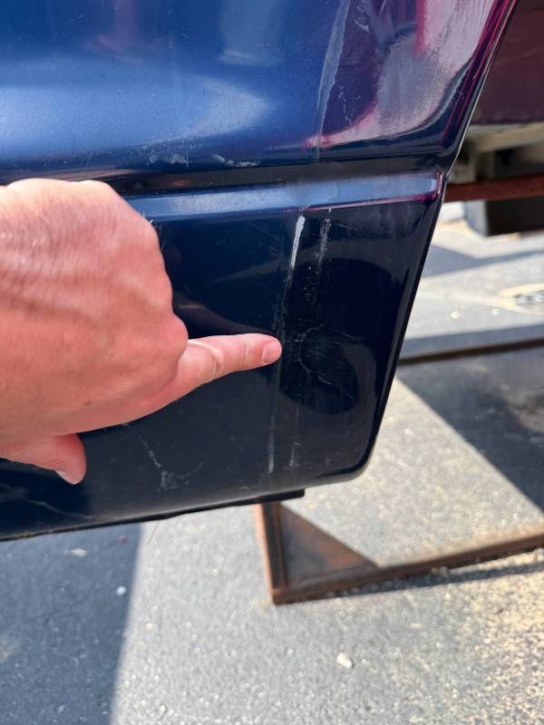 The left/driver's side front edge is also rubbed, and the left front lower has (3) quarter-sized dings along with (2) quarter-sized dents on the left side. The left side also has (3) quarter-sized dents by the body line, and the left rear at the very bottom has (5) quarter-sized dents and minor surface rust from the paint chipping away.