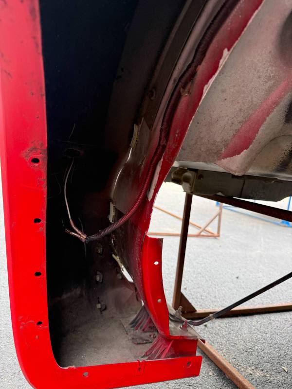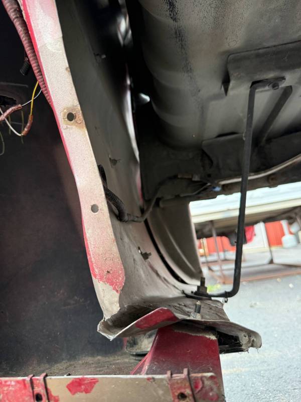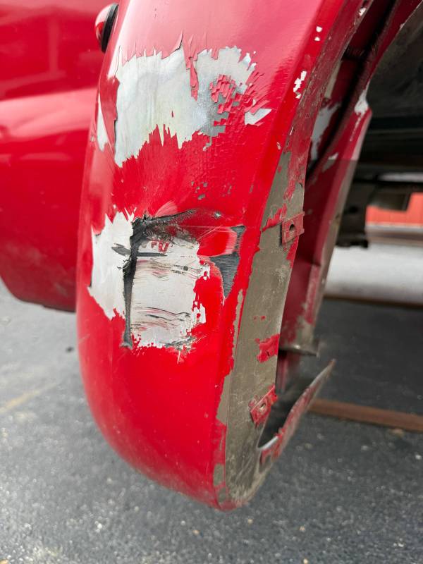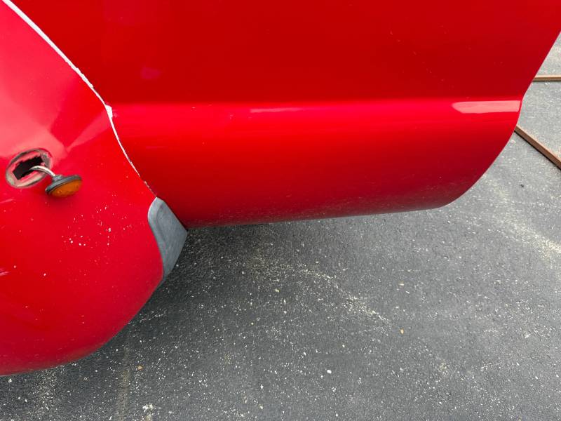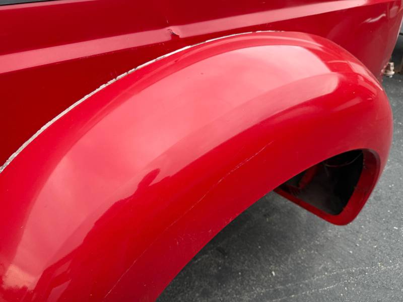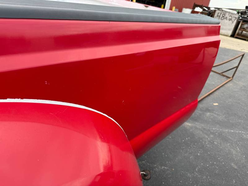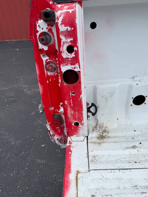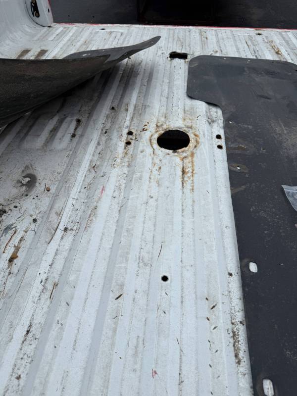 This bed comes without a tailgate and without taillights. This bed was white and then repainted red. There are (4) holes in the front of the floor from a fuel tank. There are (2) 4" holes in the center of the floor, and the left rear inner has (2) 3" bargment plug holes.