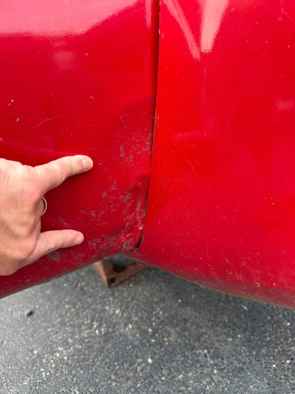 The right/passenger side rear above the taillight has a quarter-sized dent, and the right rear lower has a dime-sized dent and (2) 3" creases.
