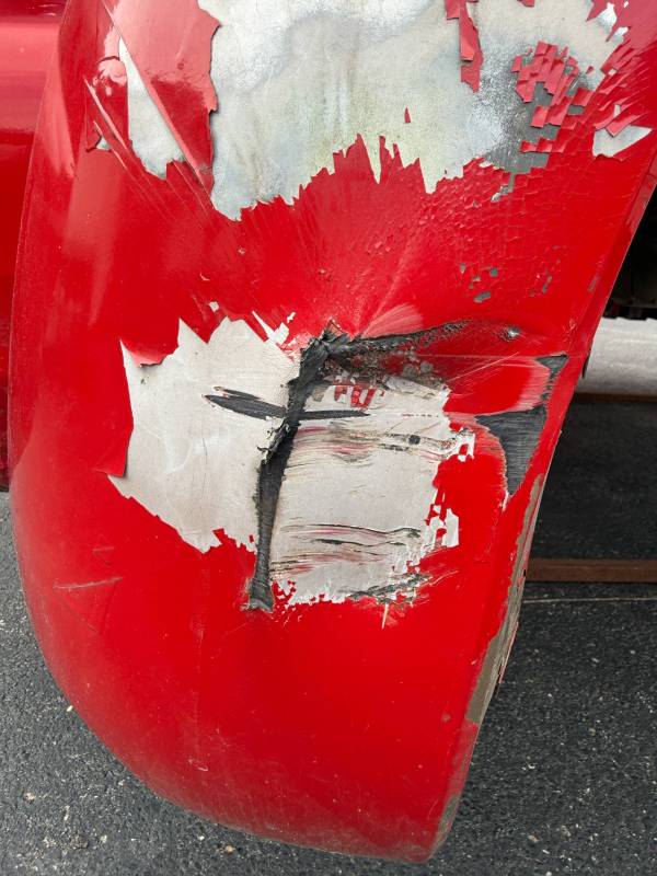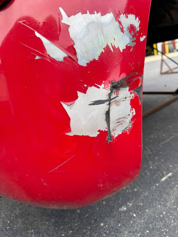 The left/driver's side is dented up and has (5) quarter-sized dents, and the left side by the top rail has an outty dent and a quarter-sized dent. The left side under the taillight is dented up.