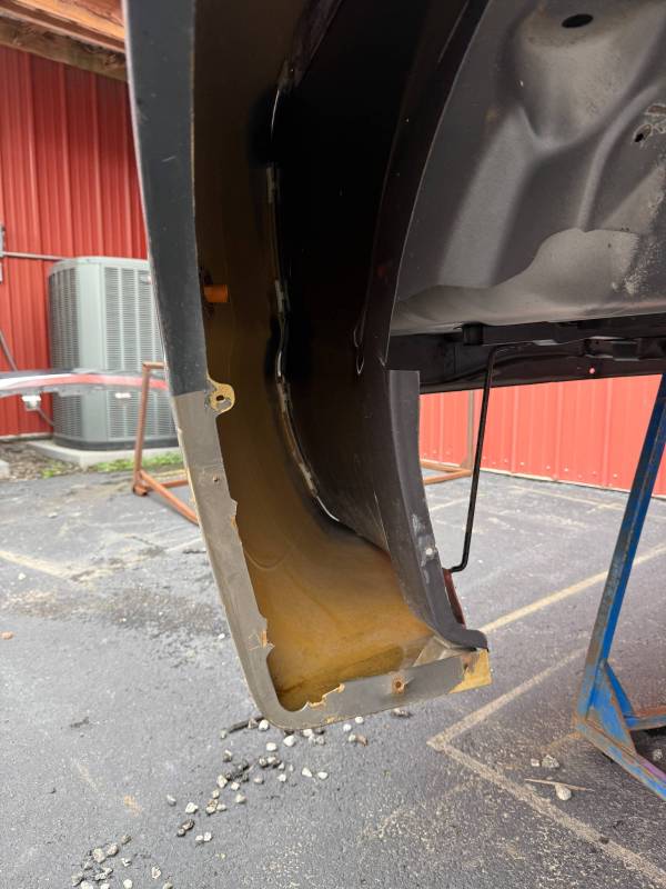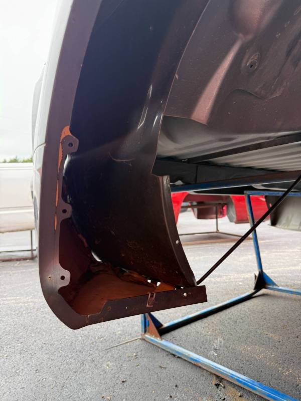Both dual fenders are missing the side marker lights, and both sides under the fenders have some dents and dings.