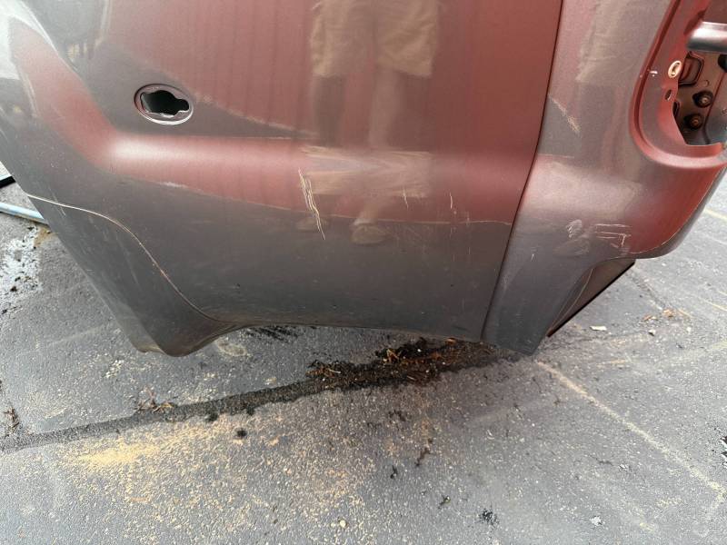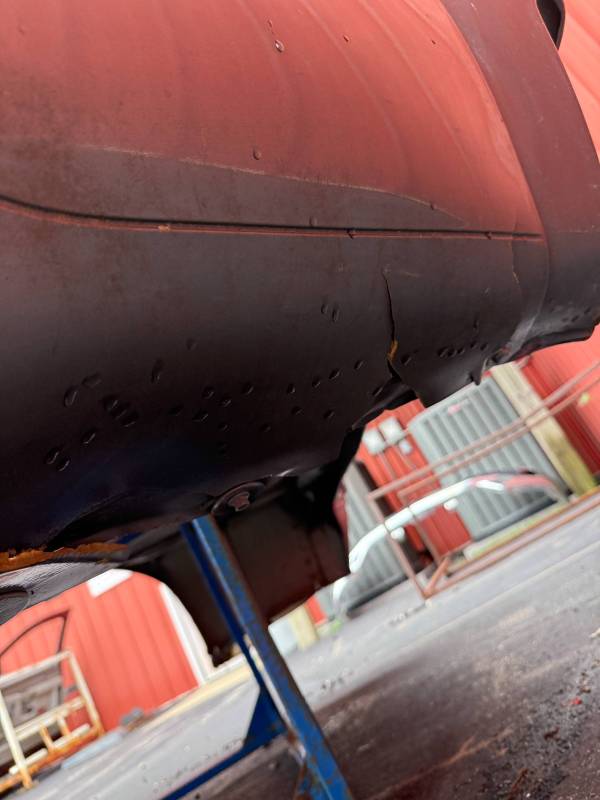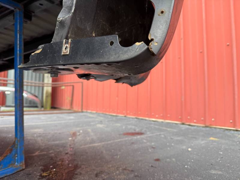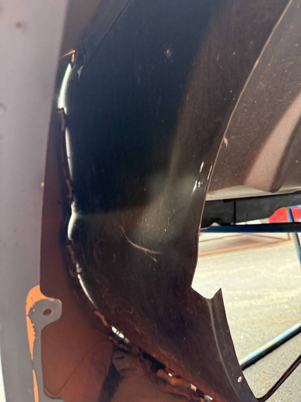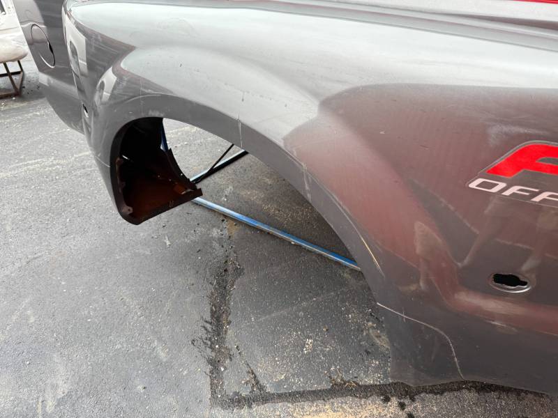 The left/driver's side dually fender has a 4" crack at the front and several cracks on the bottom of the dually fender. The fender does bolt up and is still usable. The left side also has a quarter-sized dent above the taillight opening.