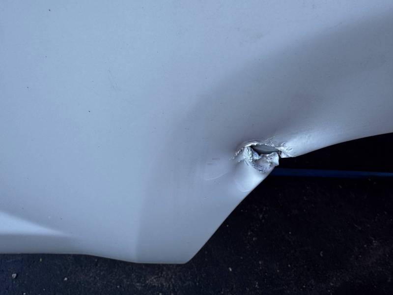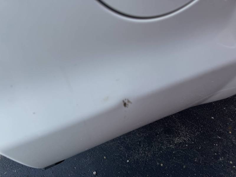 The left/driver's lower has a dime-sized dent on the body line, and the left front edge has a dime-sized dent. The left front of the wheel arch has a quarter-sized gouge in the metal and a golf ball-sized dent.