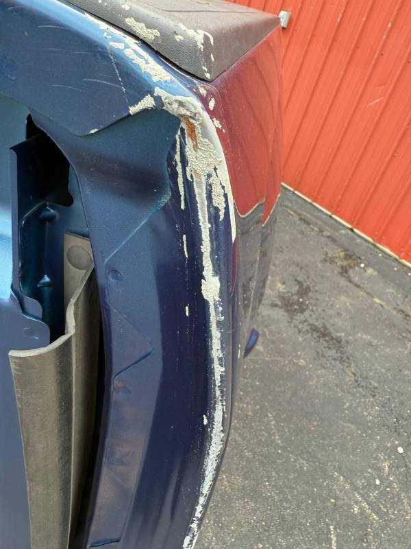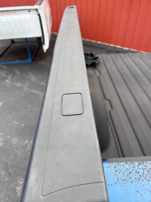 This bed comes without taillights and without a tailgate. This bed has a sprayed-in bed liner, and both front edges have a minor bend or a ding from transport. There are scratches on both sides.