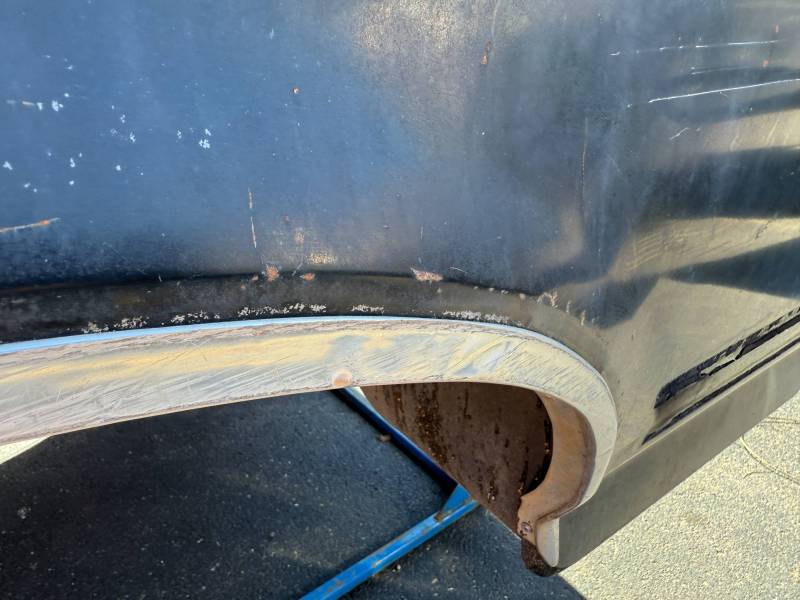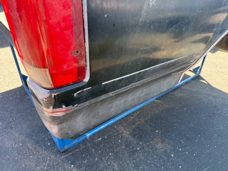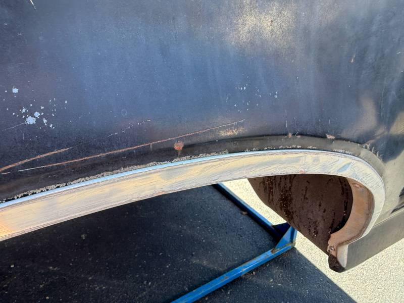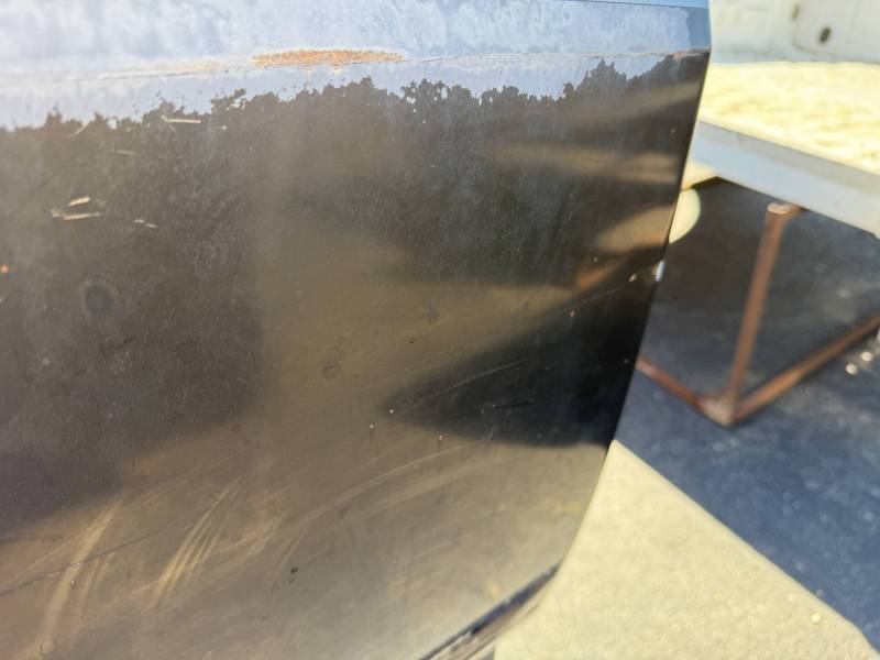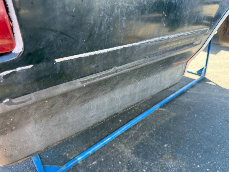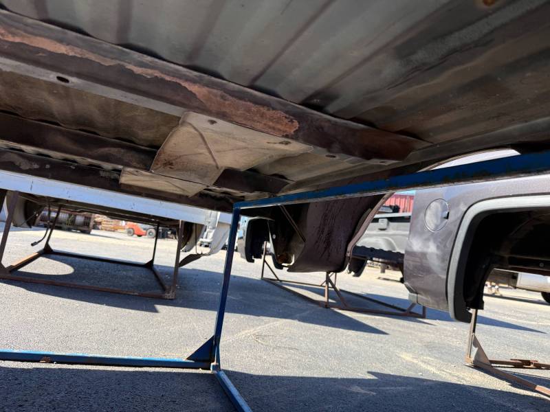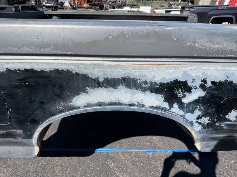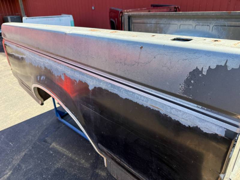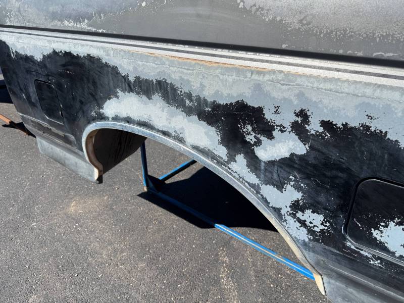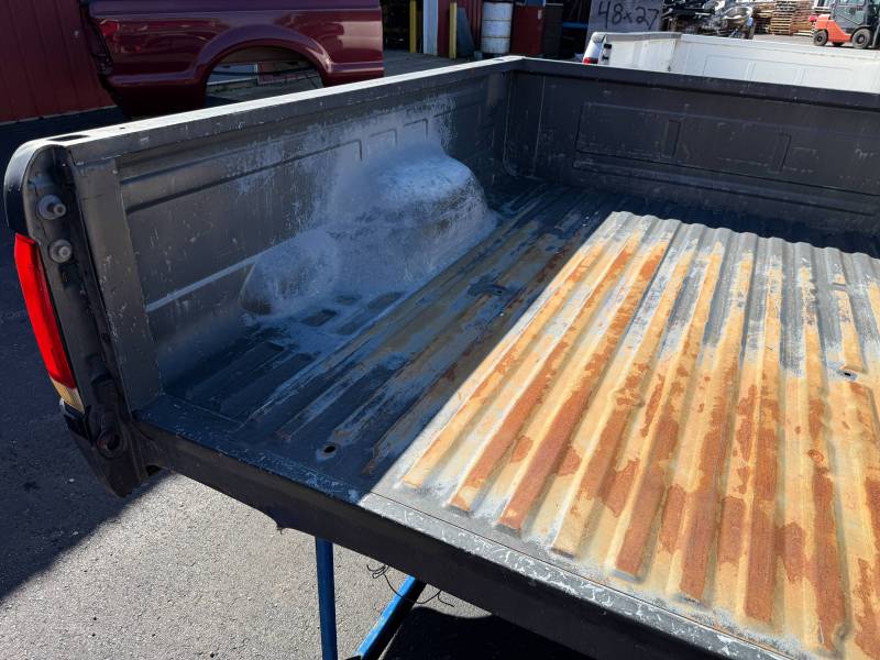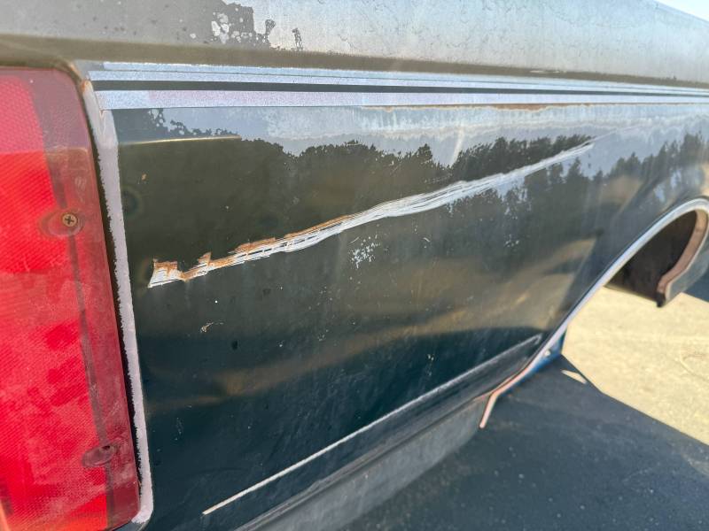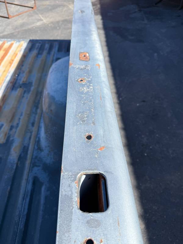 This bed comes without a tailgate, but it does include taillights. There is surface rust on the floor, and there are (7) holes drilled in each top rail, along with dings and dents on both top rails. The paint is also peeling.