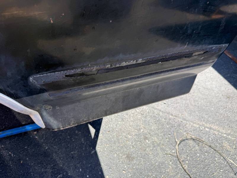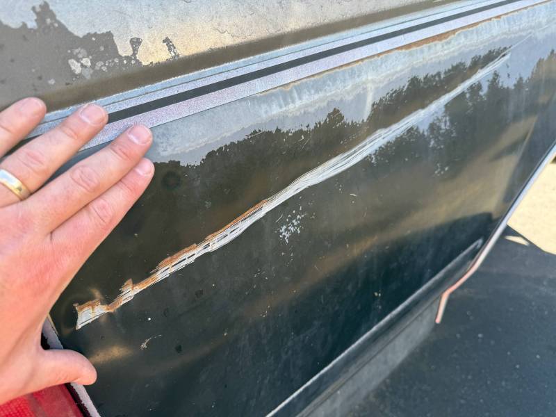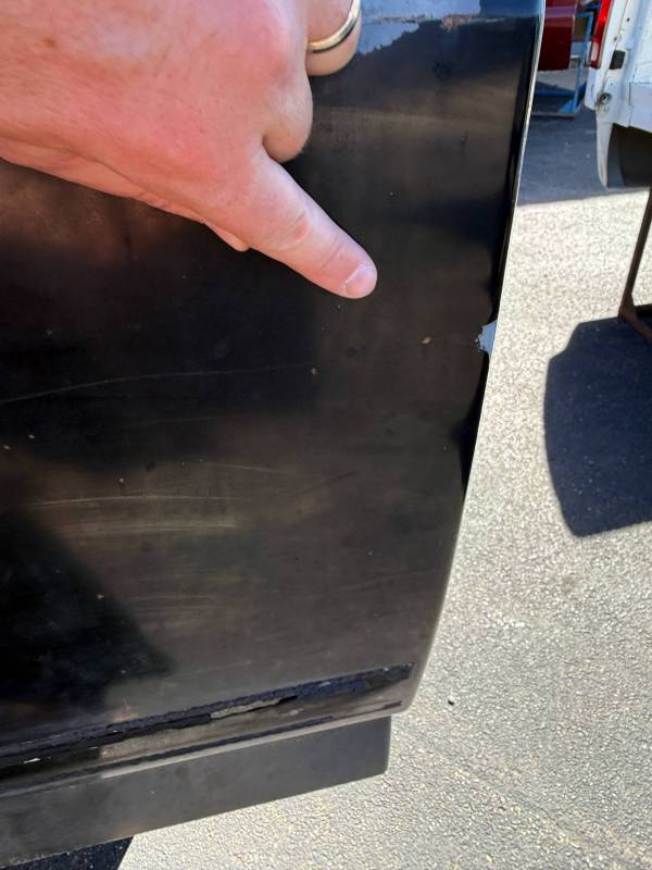 On the left (driver's) side, by the front fuel door, there is a quarter-sized dent, and on the left side, by the top bed rail, there is a crack in the metal.