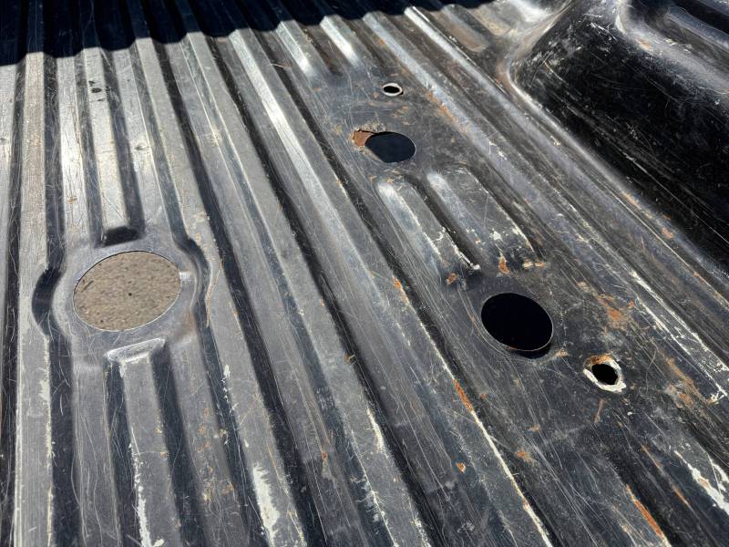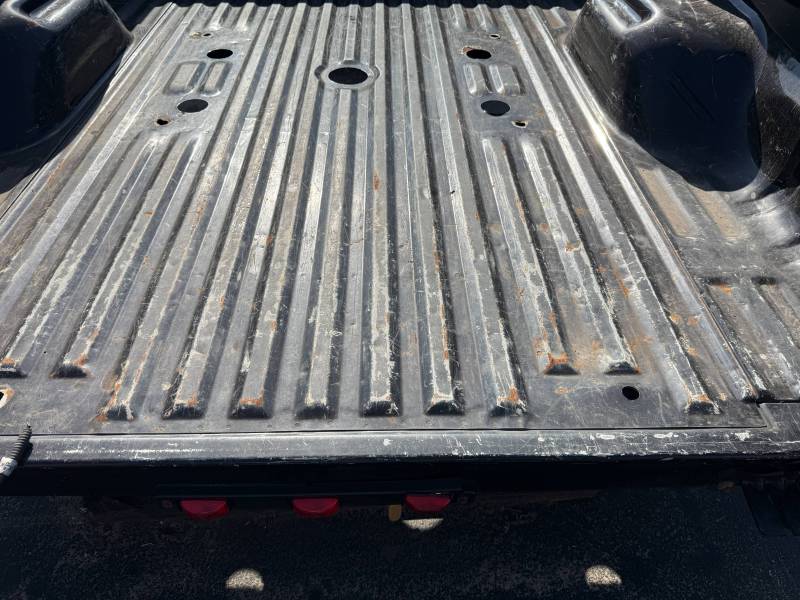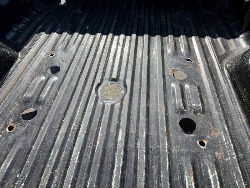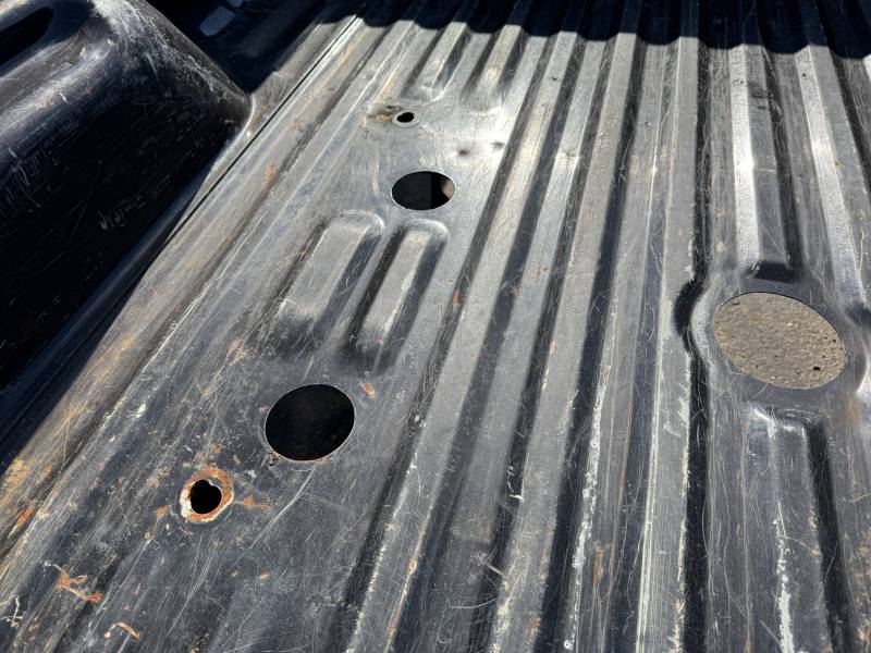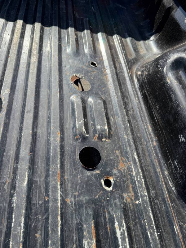 This bed comes without taillights and without a tailgate. This bed has the factory 5th wheel package holes on the floor and a factory bargment plug on the left inner bedside, along with some scratches down both sides.