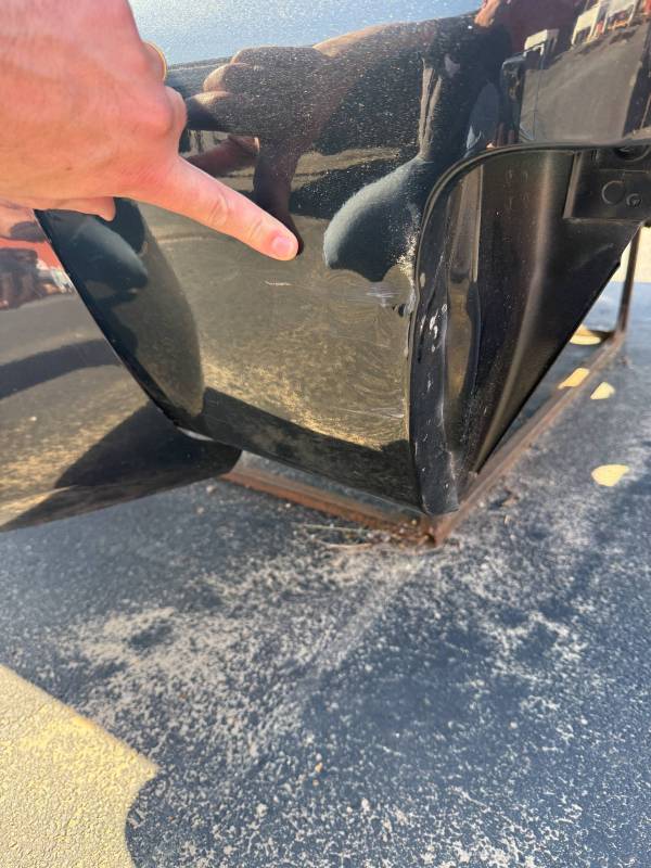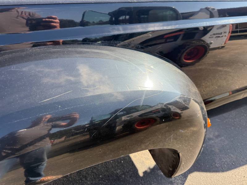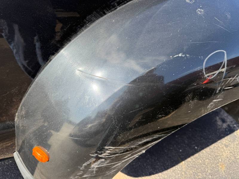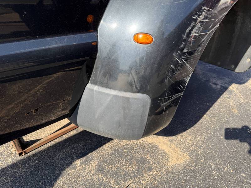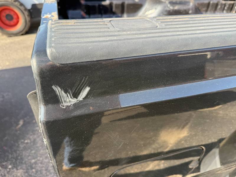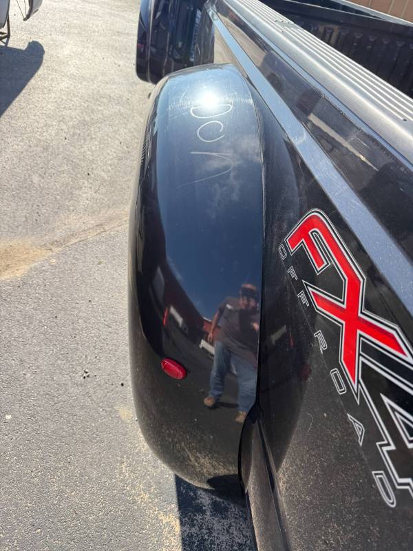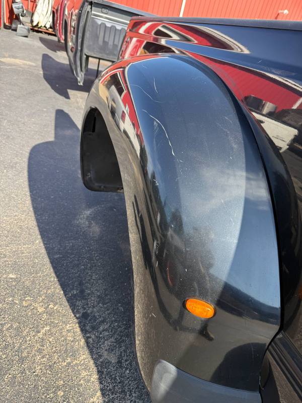 The left/driver's side rear lower has (3) quarter-sized dings and a dime-sized ding, the left side dually fender is scratched up and has several indents in the fender.