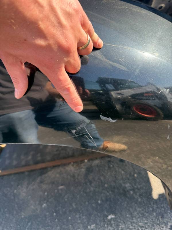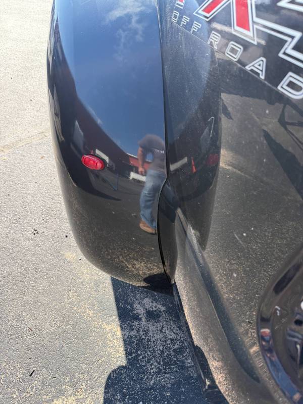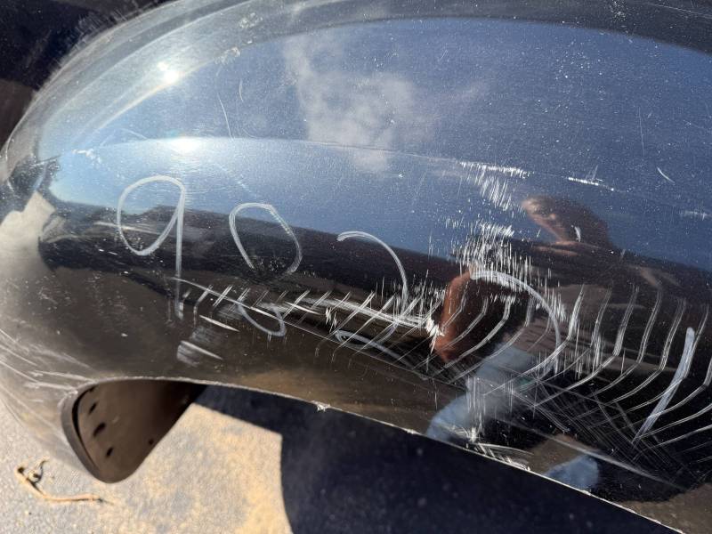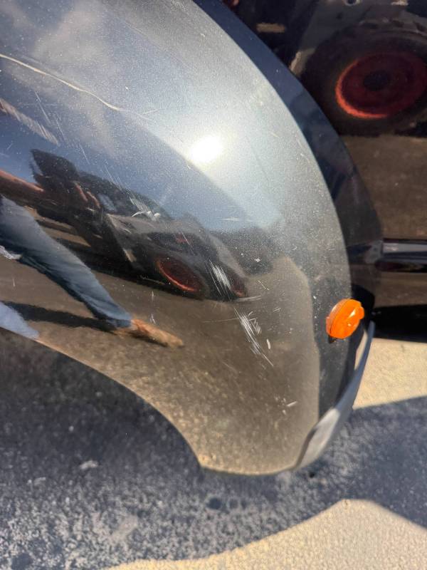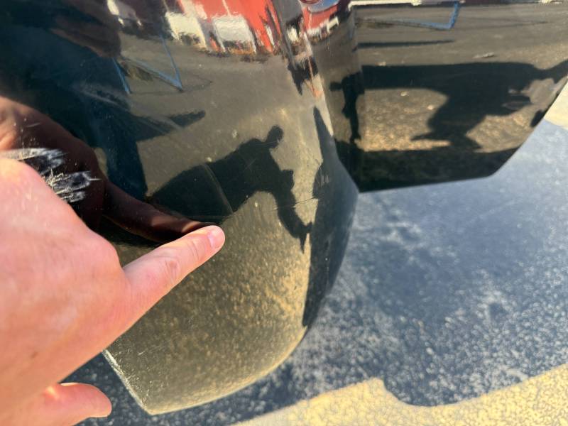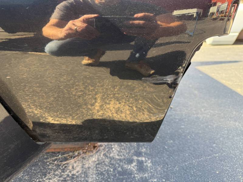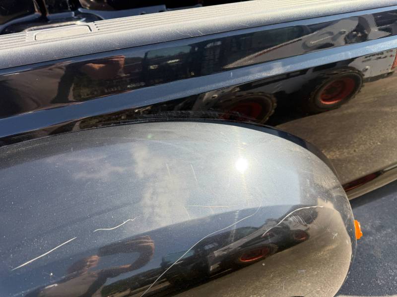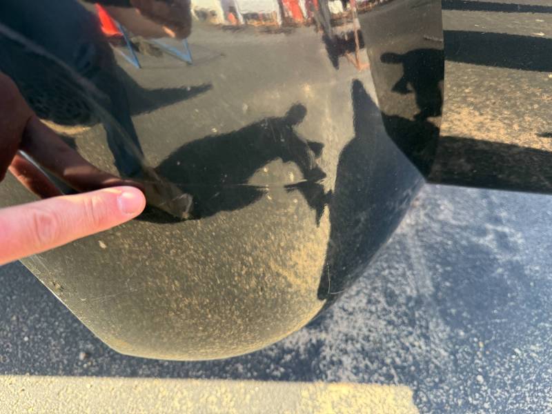 The left/driver's side rear lower has (3) quarter-sized dings and a dime-sized ding, the left side dually fender is scratched up and has several indents in the fender.