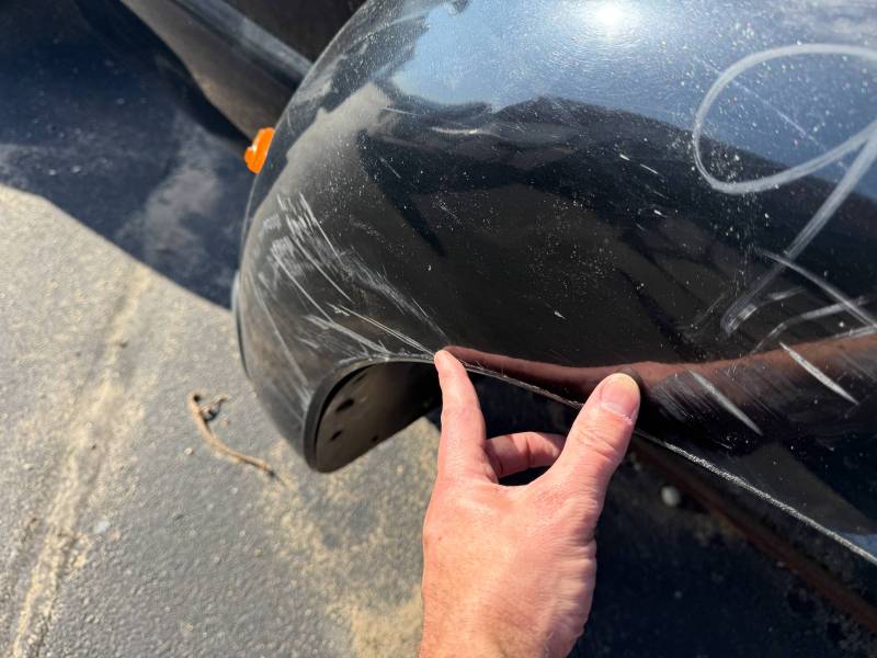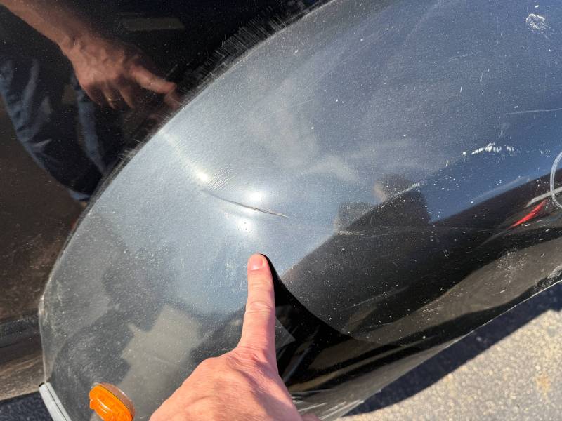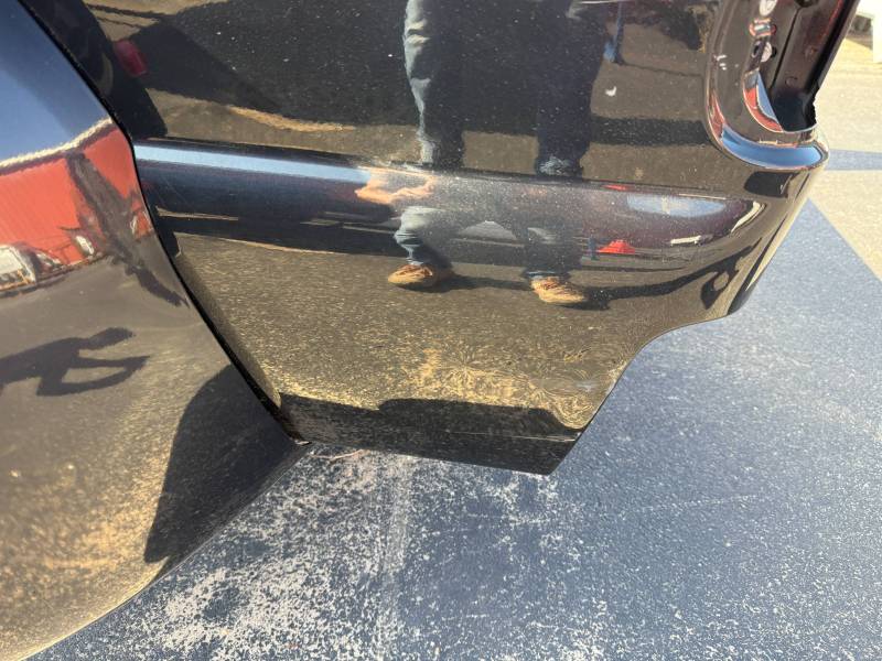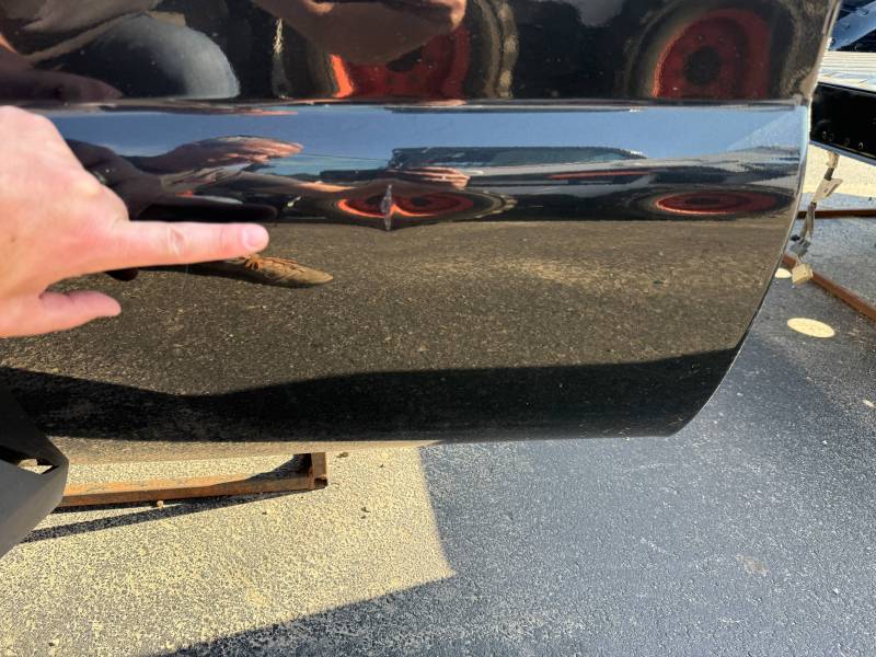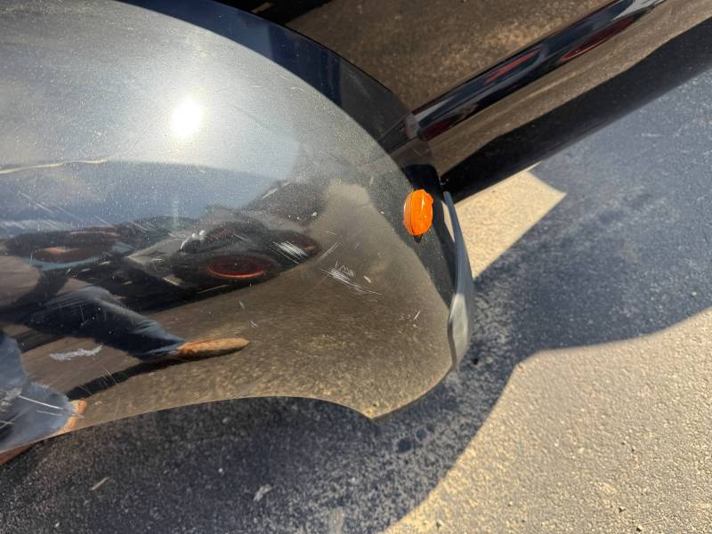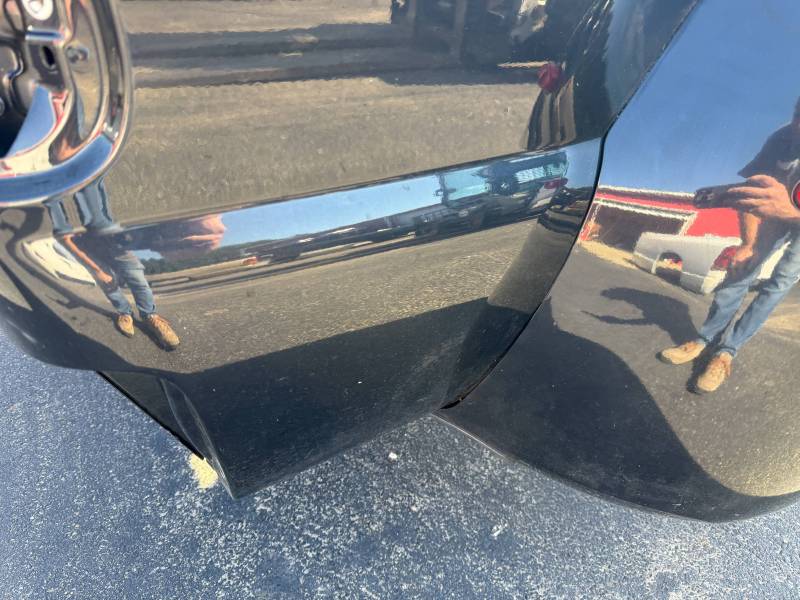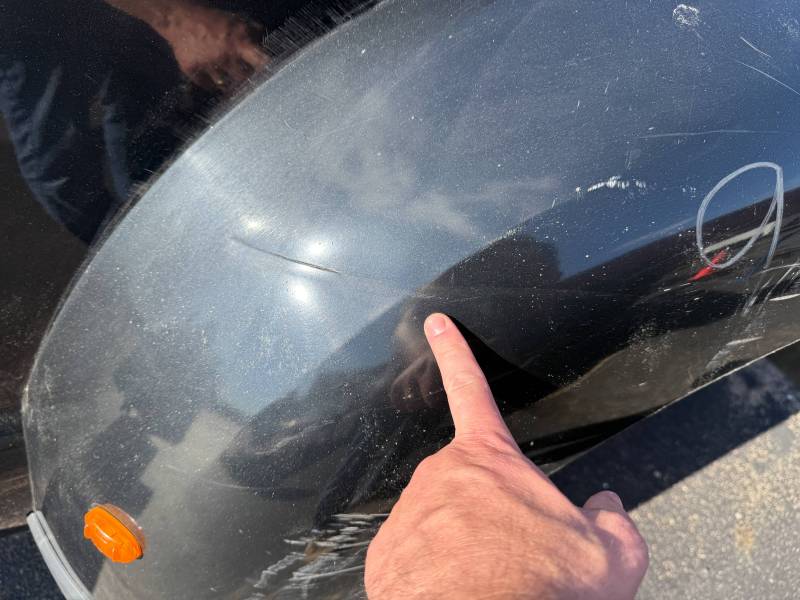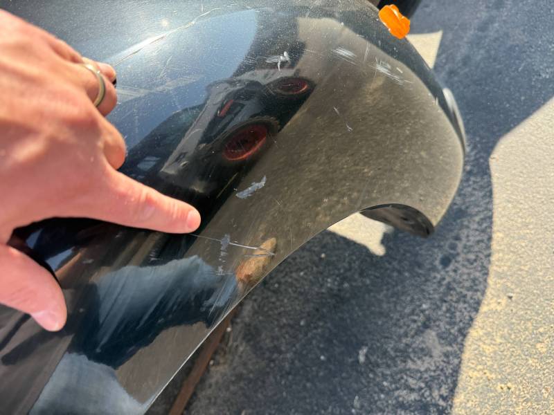 The right/passenger front lower has a quarter-sized dent, and the right rear above the taillight opening has 2) dime dime-sized dings.