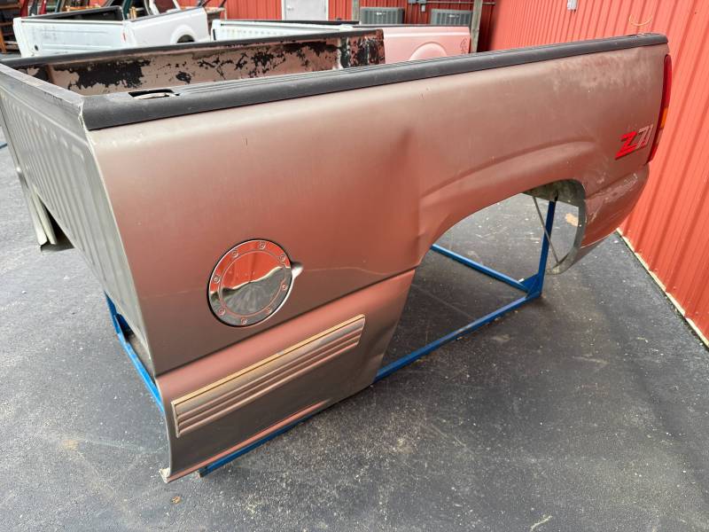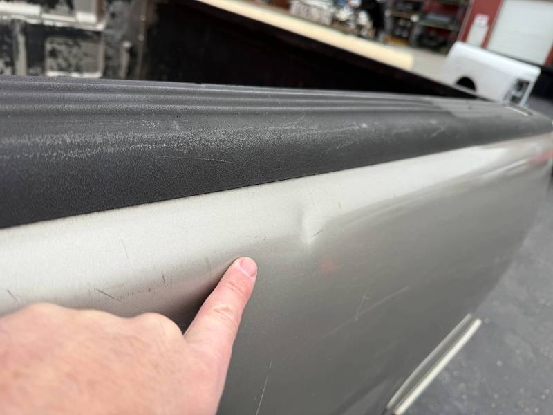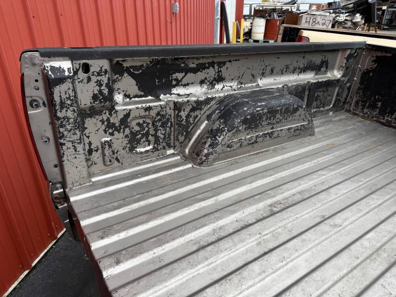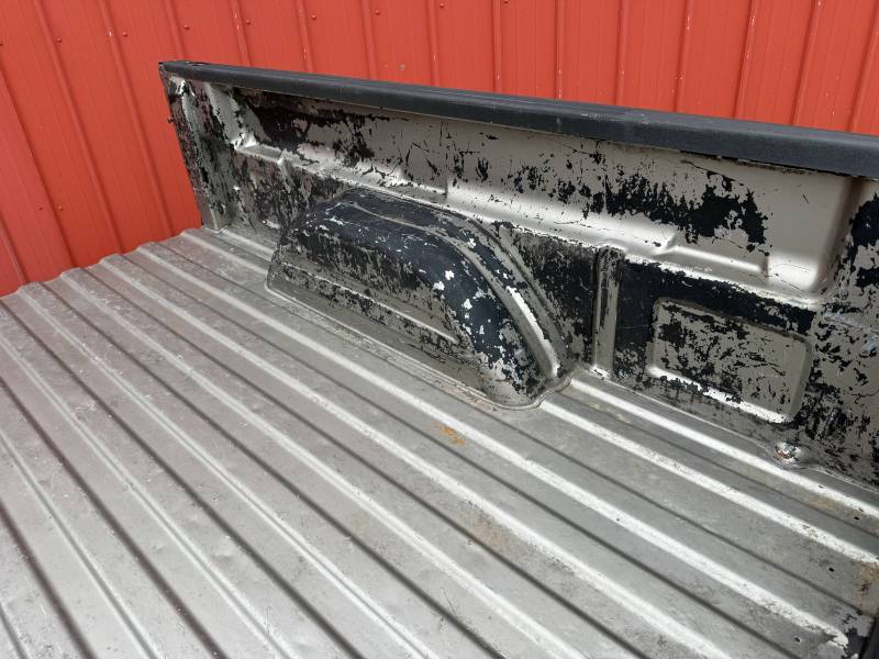 This bed comes without a tailgate, but it does include taillights and plastic bed rail caps. The inside of the bed has some areas that were painted black. There are some minor dings on the floor and (2) 1/8" holes drilled in the header panel.
