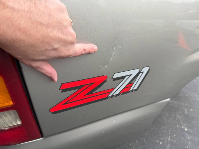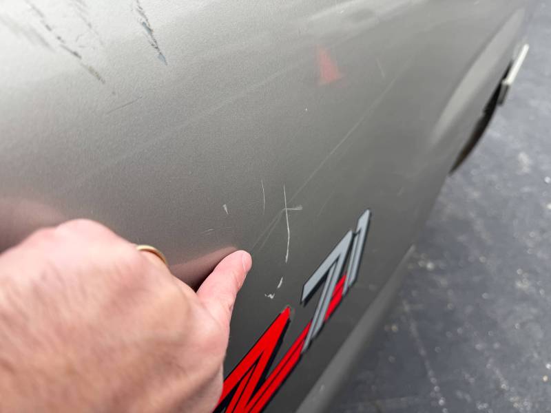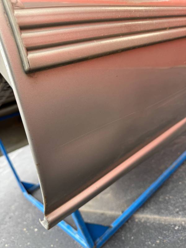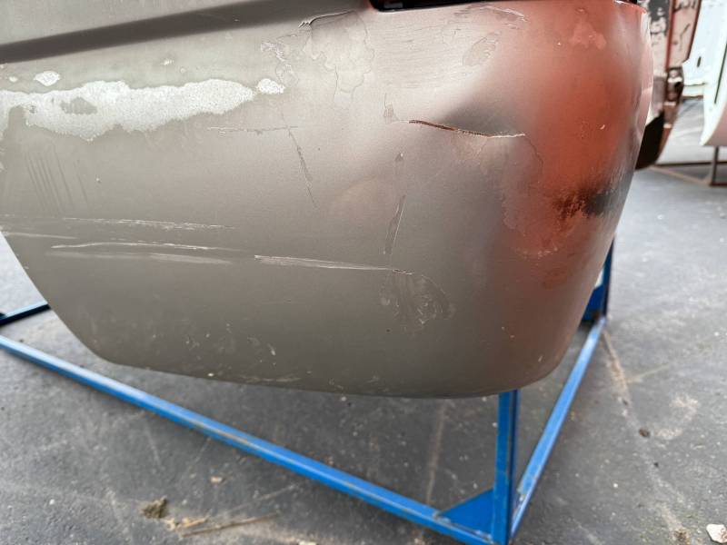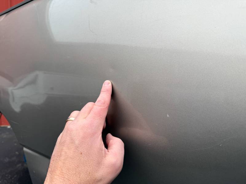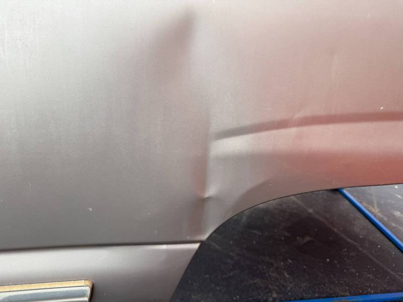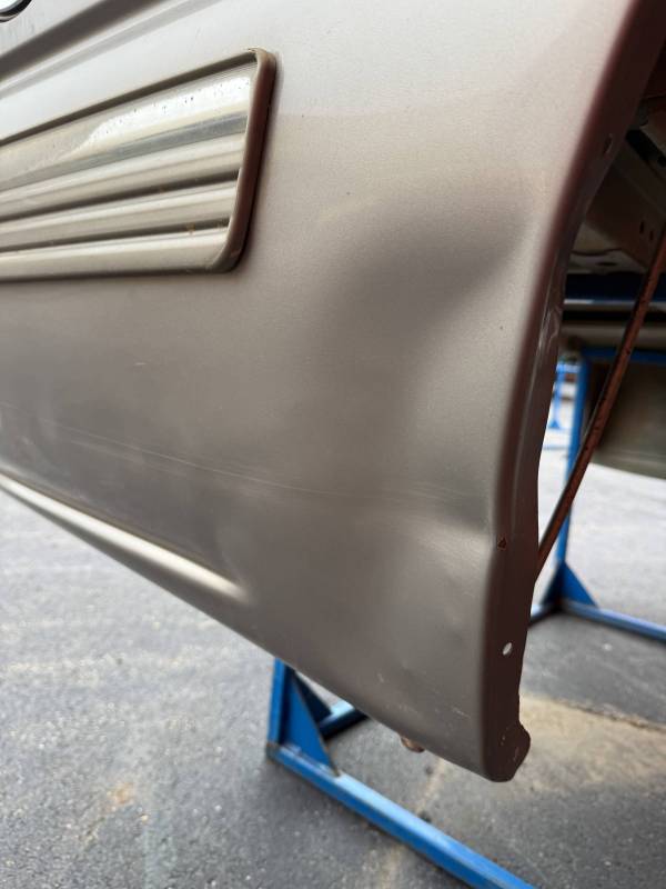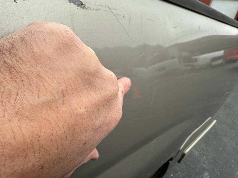 The right/passenger side by the top rail has (4) quarter-sized dents, and the right rear has a quarter-sized ding, and the right lower has a 4" crease from a bumper being pushed in. The right front has a dime-sized ding.