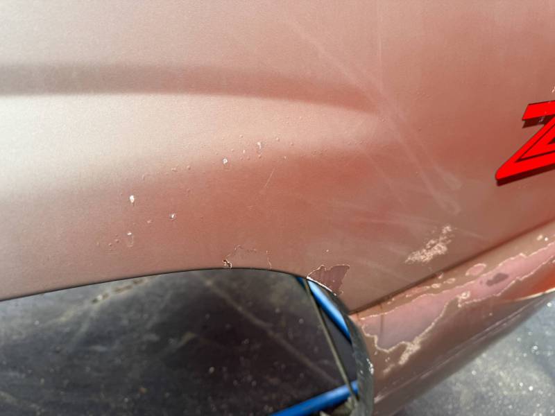 The left/passenger side has faded, peeling paint. The left side by the top rail has (3) quarter-sized dents, and the left front has a significant dent along with (3) softball-sized dents. The left side lower has (3) quarter-sized dents along with a 10" crease.
