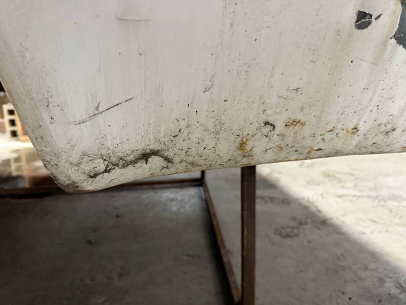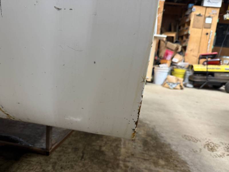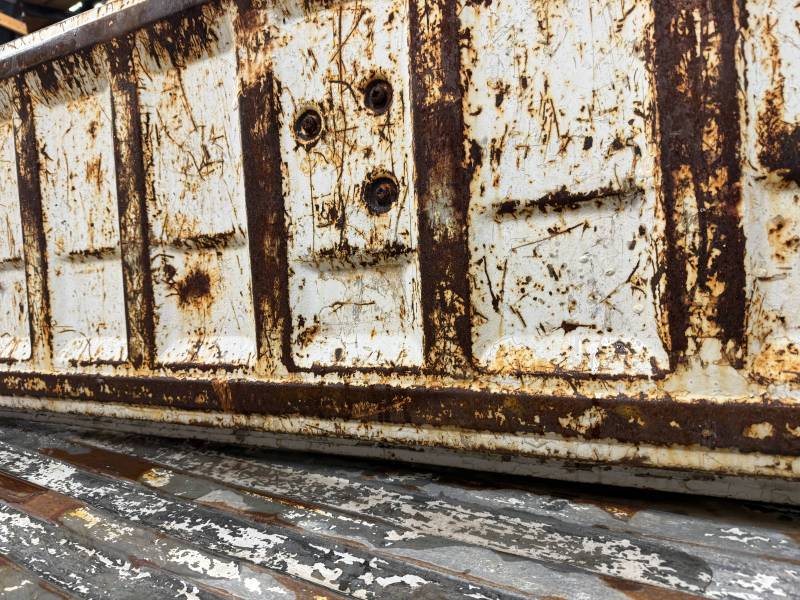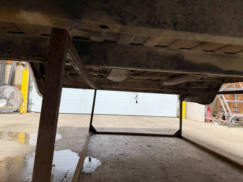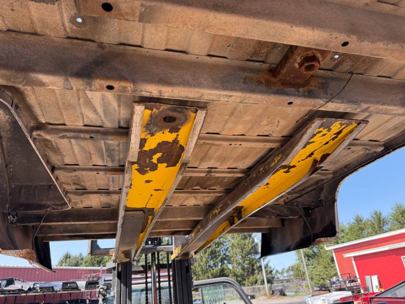 This bed comes with taillights and a tailgate with holes drilled in it, along with a dent on the top and a bow. The right/passenger tailgate hinge is missing, and there is a surface on the floor. There are some minor dents on the floor. There are also seven (7) - 1/4" holes drilled in the floor and eight (8) holes drilled in each top rail. The very rear cross-member has been notched out for a lift.