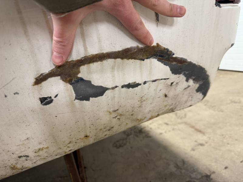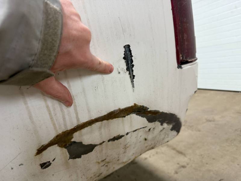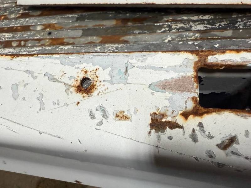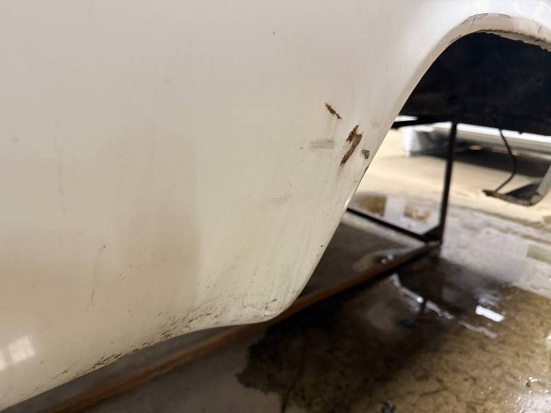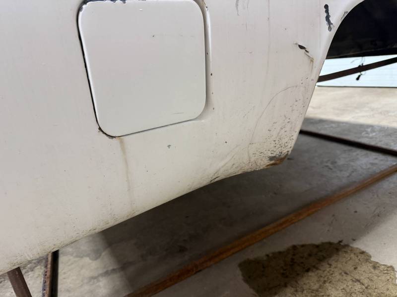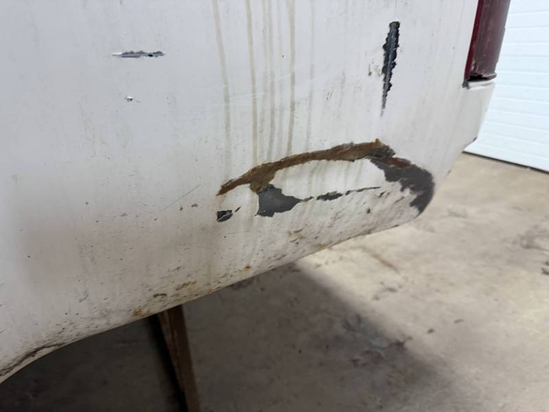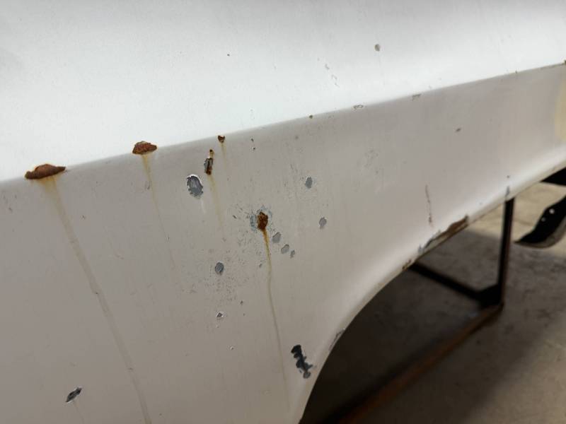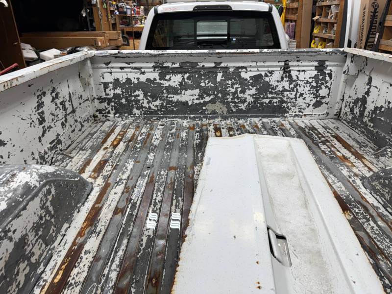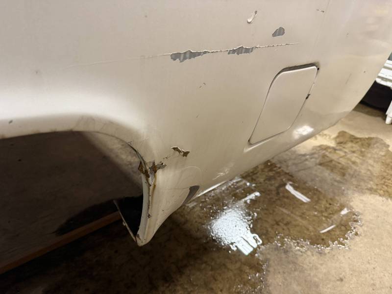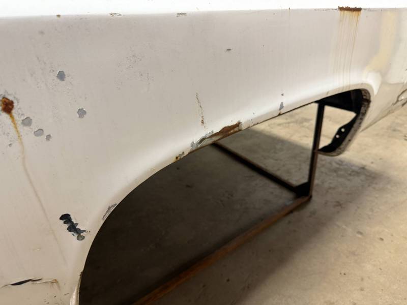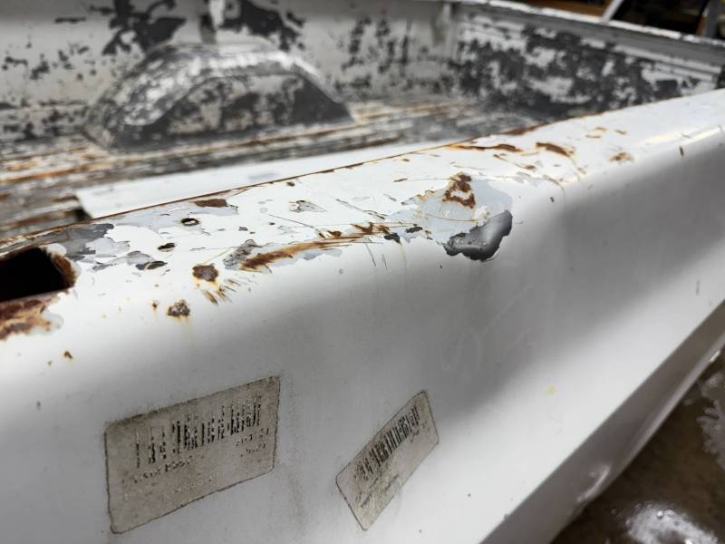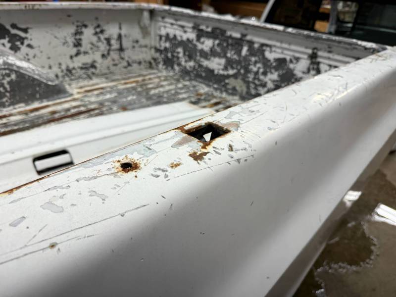 The right/passenger's side has a goofball-sized dent on the top rail, and the right rear and front wheel areas have quarter-sized dents, and both bed sides have Bondo in them.
