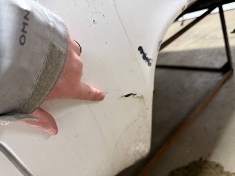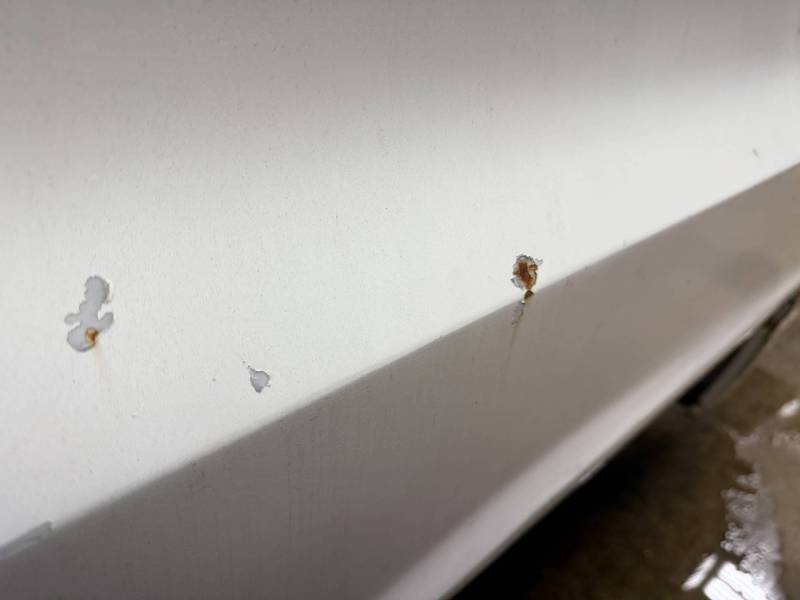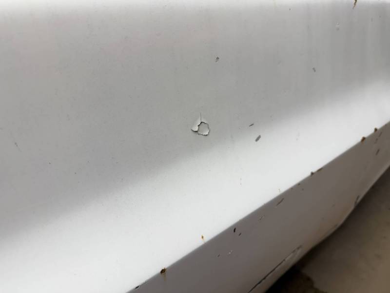 The left/driver's-side front lower has 2 quarter-sized dents, and the left rear lower is dented all over. The left rear also has a quarter-sized dent.