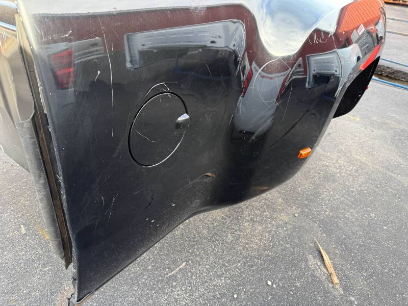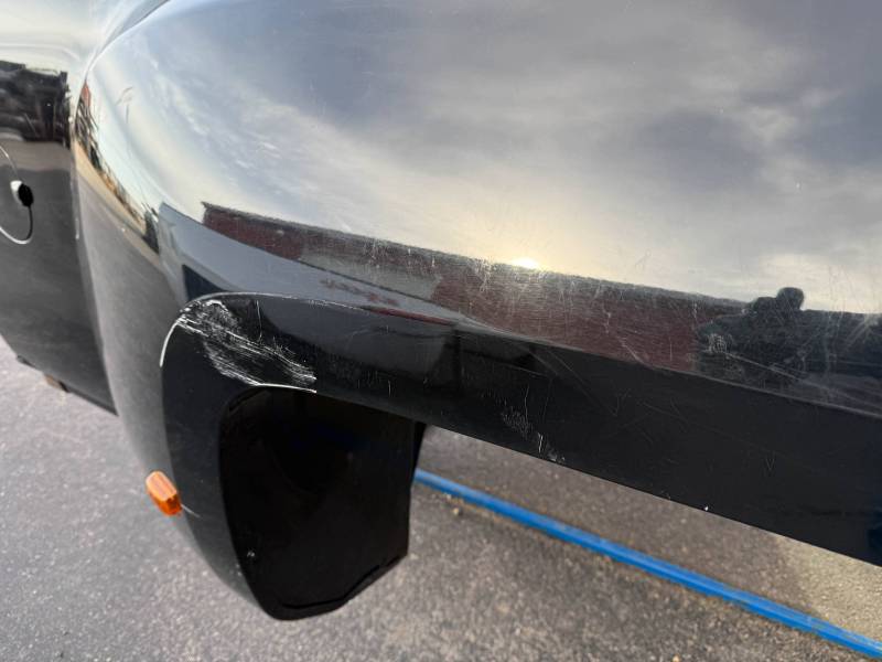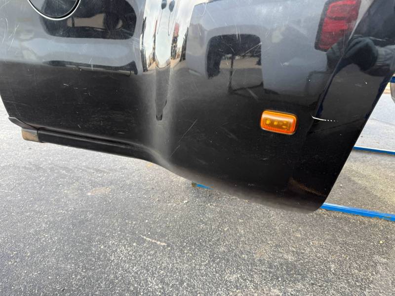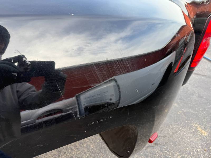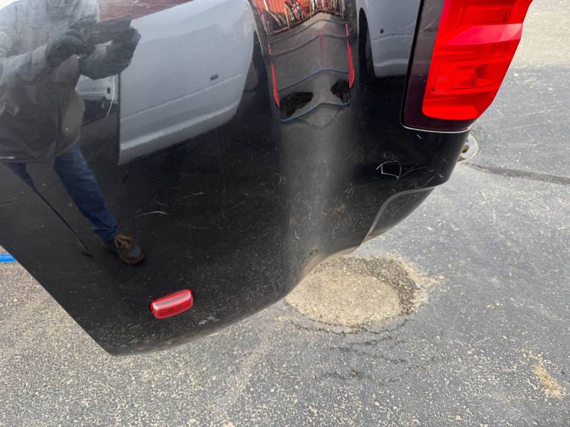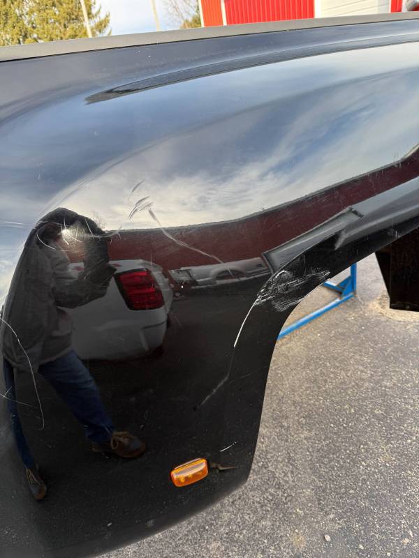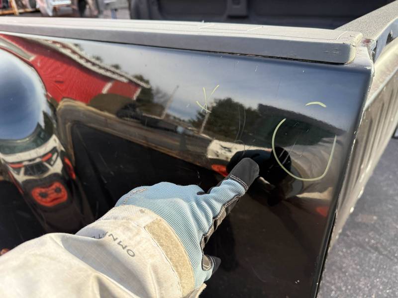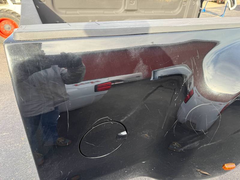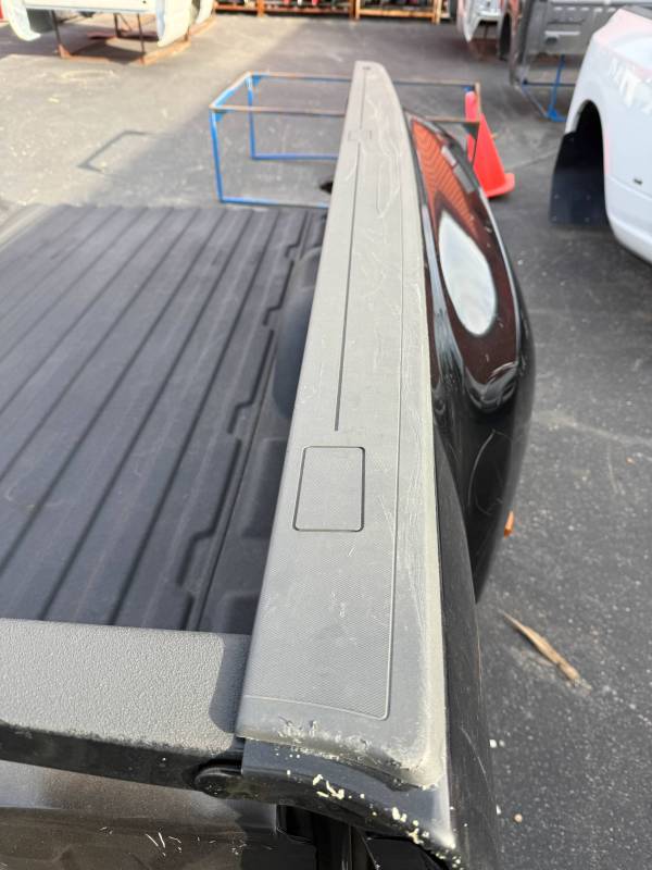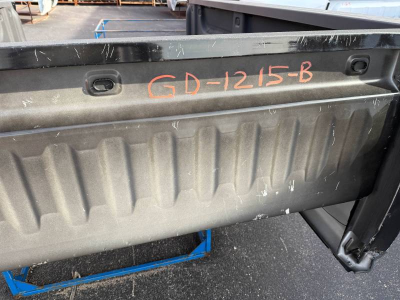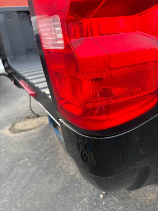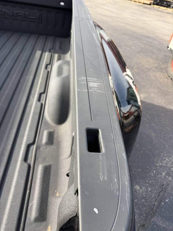 This bed comes with taillights, although the right side taillight has a minor crack. This bed does not include a taillight. There is a Denali logo embossed on the header panel along with a sprayed-in bed liner on the bed floor. Both bedside have scratches and need to be painted. Both plastic top rails have scratches, too.
