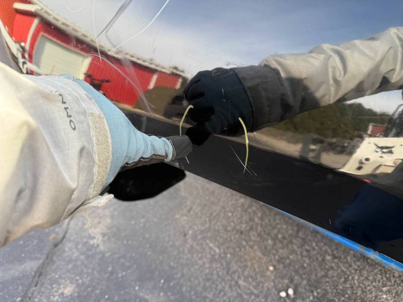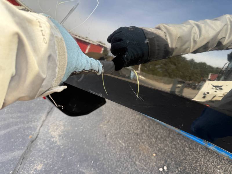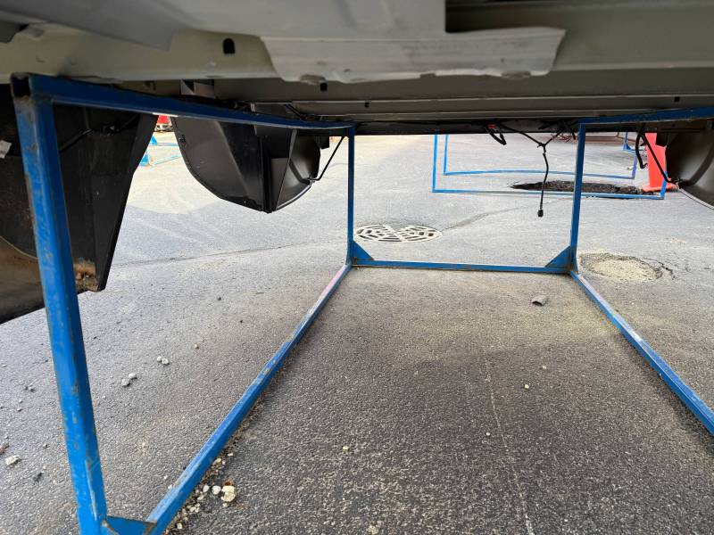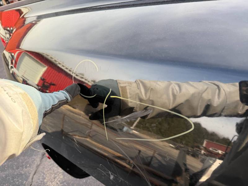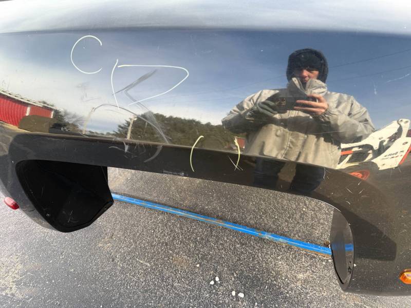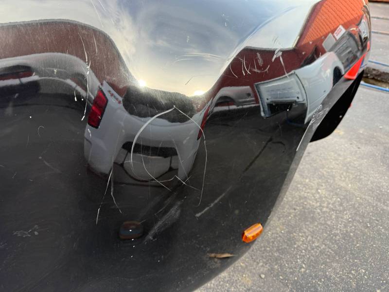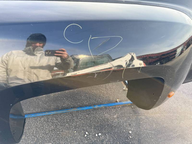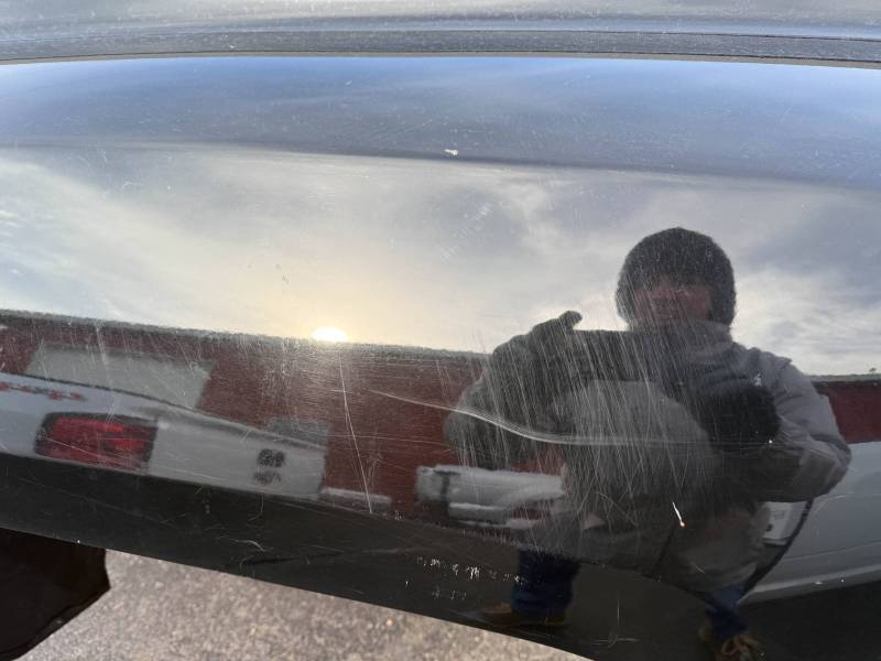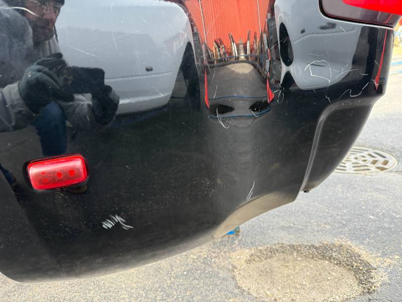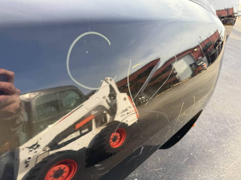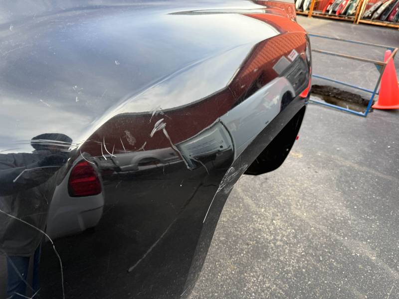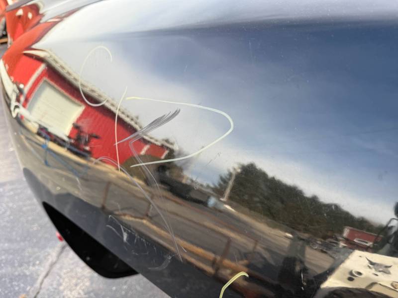 This bed comes with taillights, although the right side taillight has a minor crack. This bed does not include a taillight. There is a Denali logo embossed on the header panel along with a sprayed-in bed liner on the bed floor. Both bedside have scratches and need to be painted. Both plastic top rails have scratches, too.