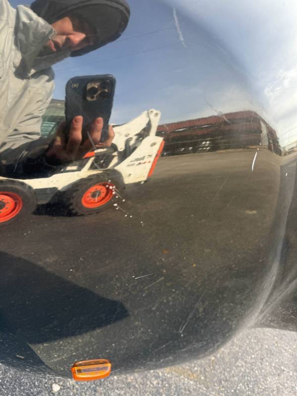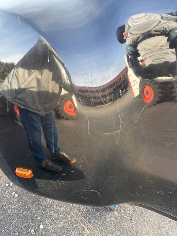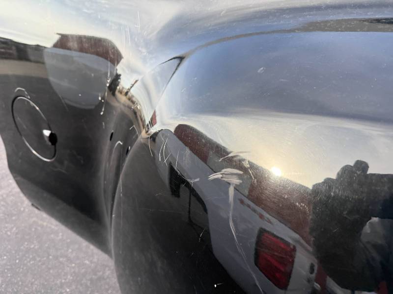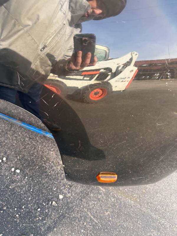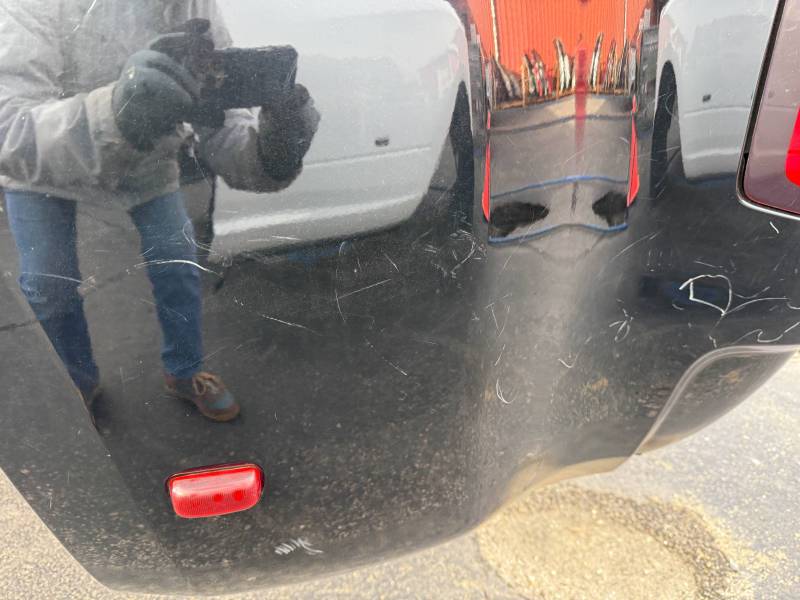 The right/passenger side dually fender has (2) quarter-sized dents and (2) dime-sized dents on the wheel arch. The right front has a dime sized ding.