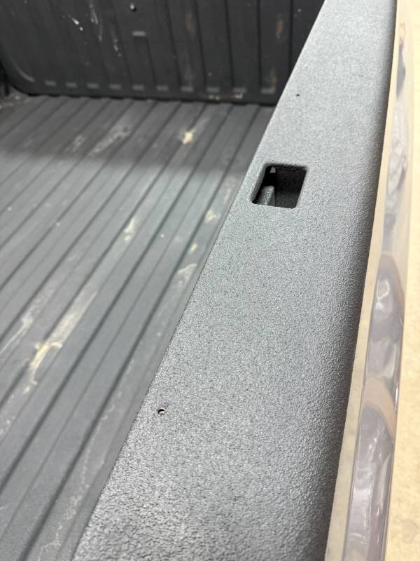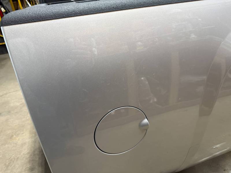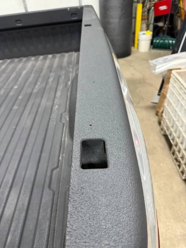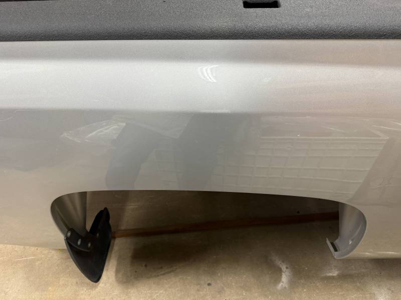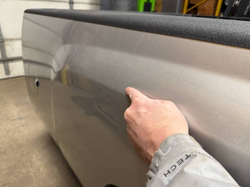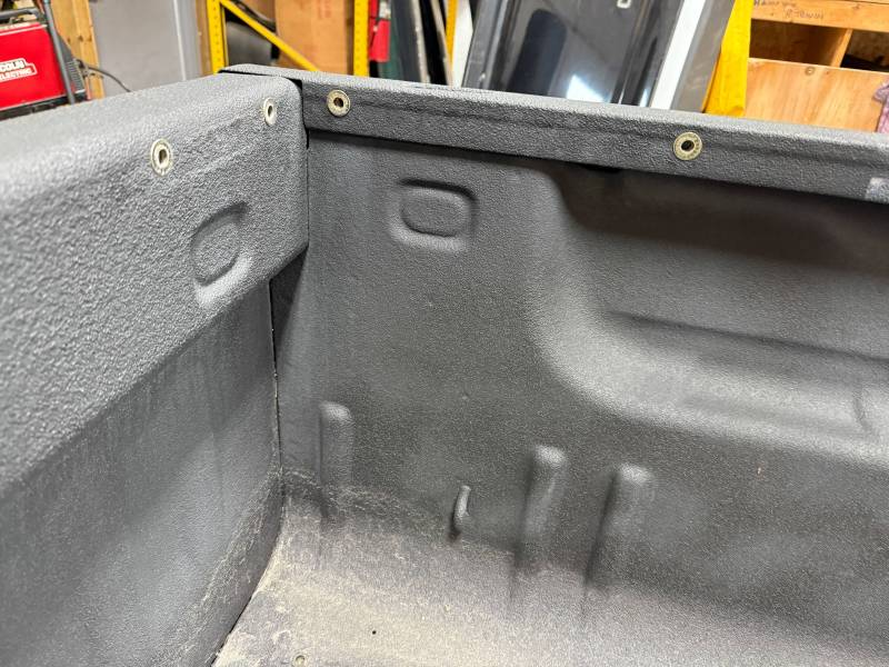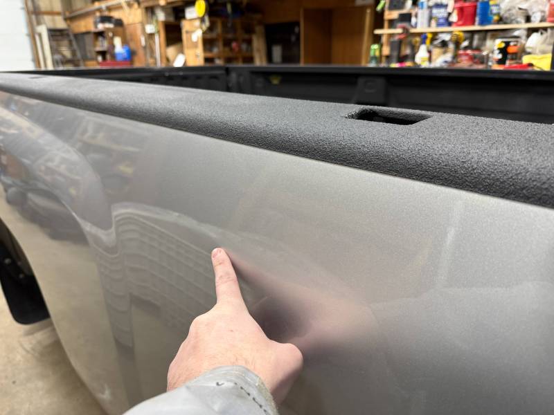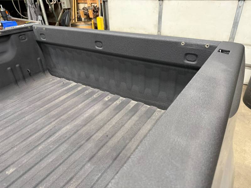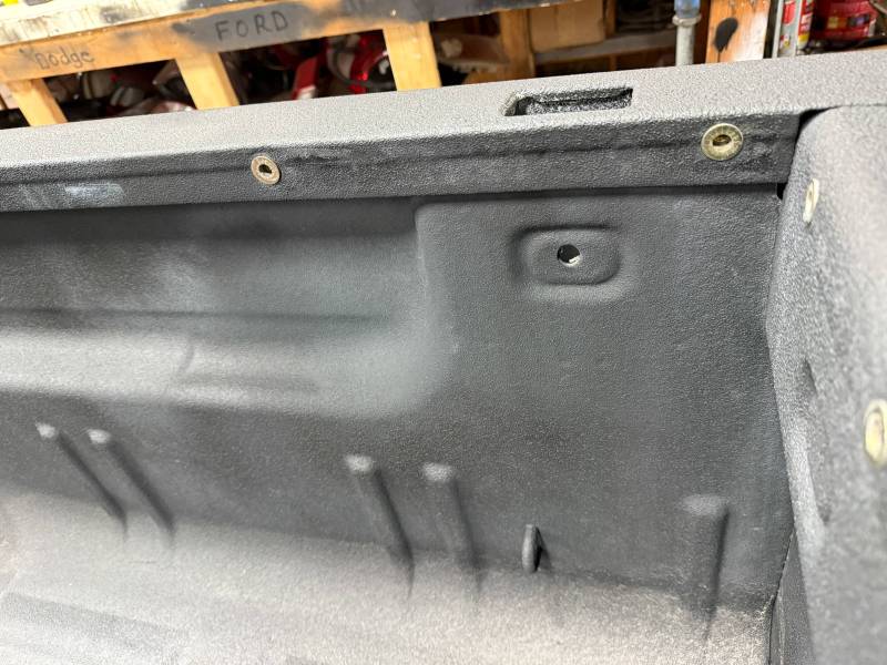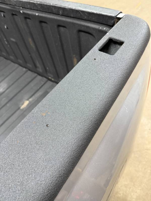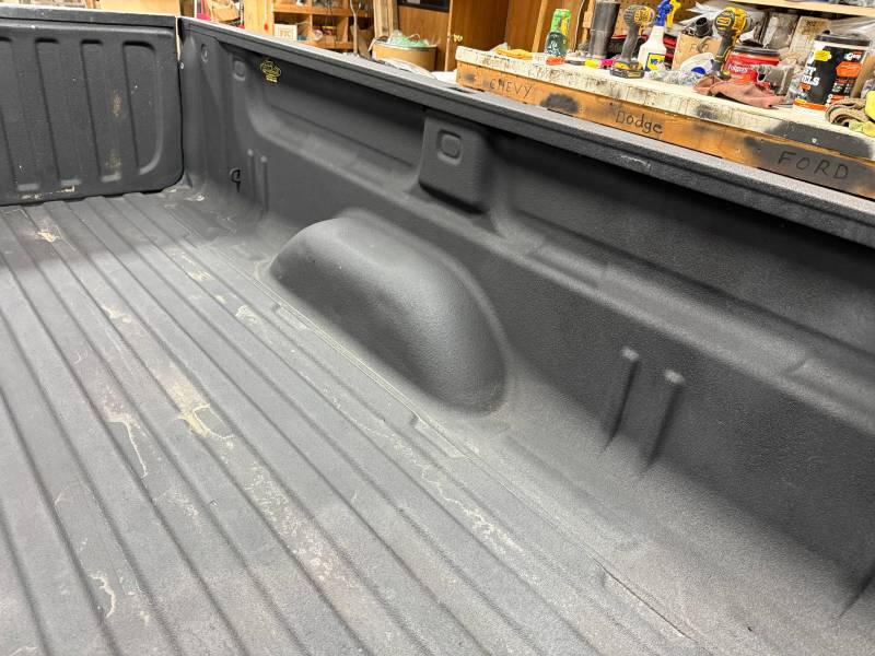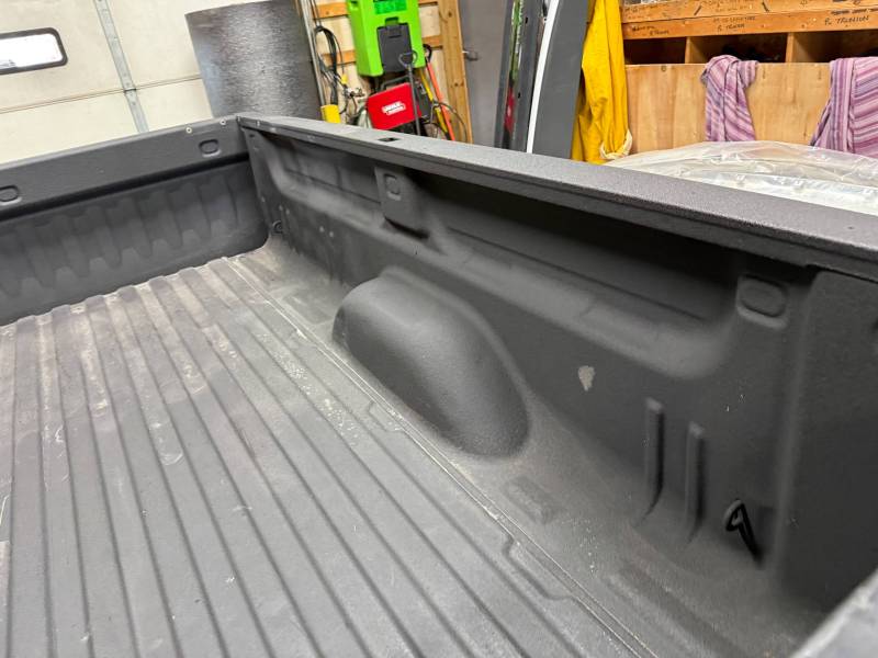 This bed comes with taillights, though the left one has a minor chip. This bed also includes a tailgate; there are scratches on its exterior. The top of the tailgate has an indent or bulge from something hitting it, but it is still a very usable shape. The bed also includes black molded husky mud flaps, and the Line X has a sprayed-in bed liner on the floor and up onto the top rails.